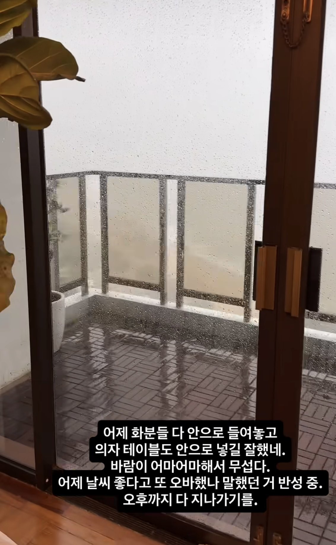 그는 집 안에서 촬영한 영상을 함께 공개했다. 테라스 바닥은 빗물로 가득했고, 화분 속 식물은 거센 비바람에 심하게 흔들리고 있었다.