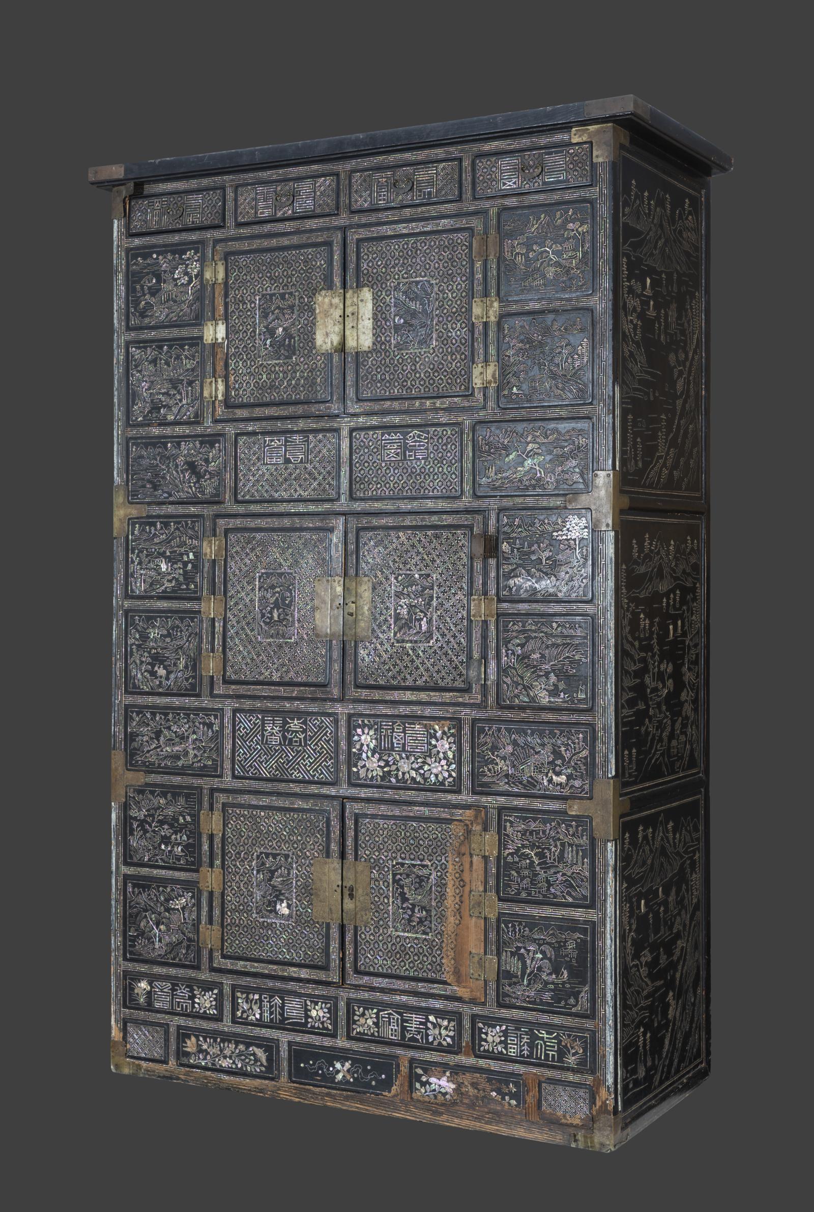높이 180cm에 이르는 이 삼층장은 문자와 꽃, 과실 등의 다양한 무늬가 나전으로 장식됐다. 19세기 말 제작된 것으로 추정되며 유사한 크기와 제작 양식을 갖춘 사례가 드물어 가치가 높다. 당대 삼층장은 왕실과 상류층 사이에서 유행했으며, 왕실 자녀가 분가하거나 출가할 때 필수품으로 여겨졌다.