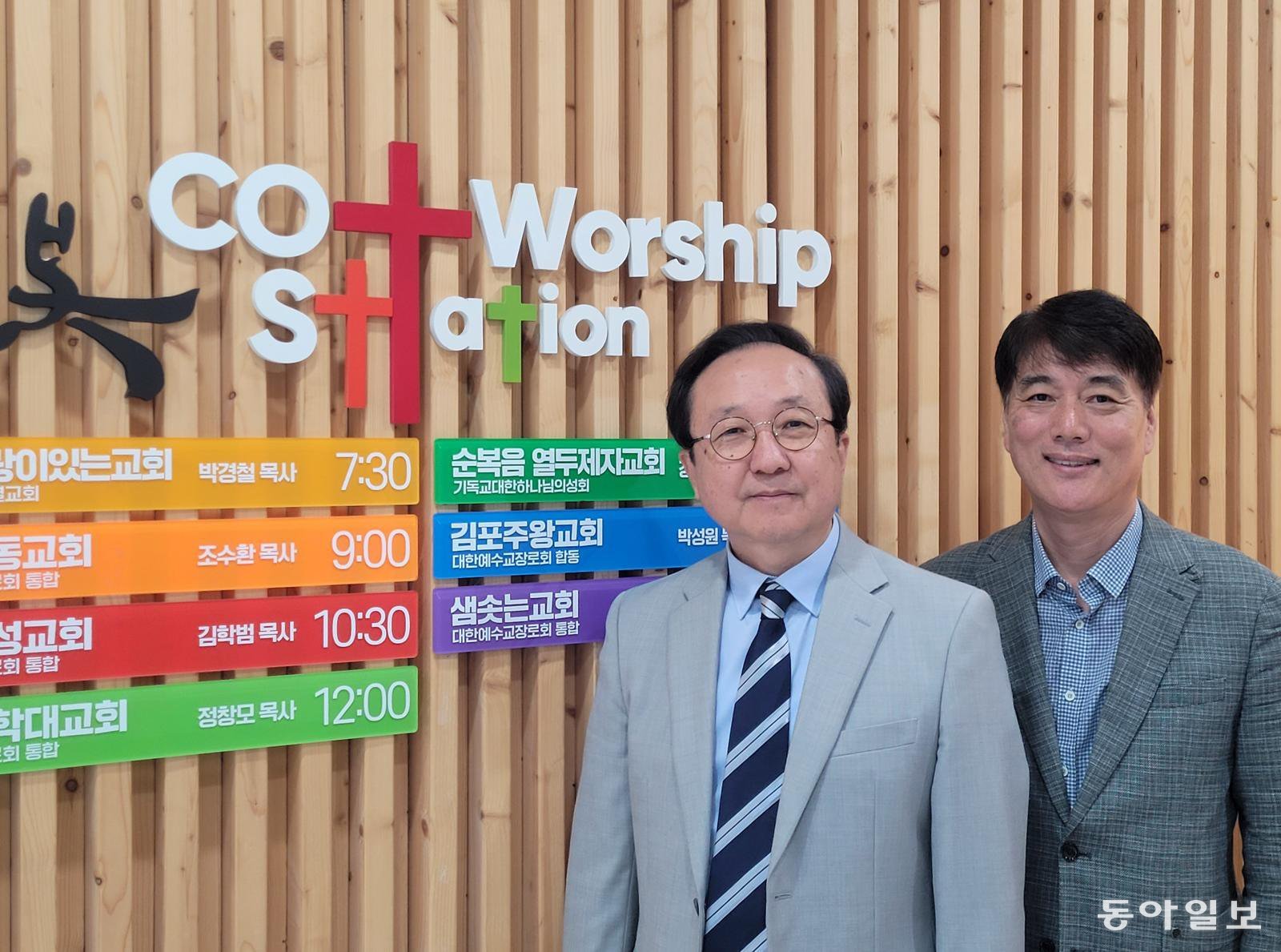 경기 김포 르호봇 코워십 스테이션에서 공유교회에 대해 설명하고 있는 김학범 목사(왼쪽)와 김인홍 어시스트 미션 사무총장. 김 목사는 “공유교회는 작은 교회들이 교회 운영에 드는 막대한 비용과 행정 부담에서 벗어나 사역 등 교회 본연의 활동에 집중하는데 큰 도움을 준다”라며 “물리적 공간은 작지만 에너지는 어느 교회 못지 않게 크고 충만하다”고 말했다. 김포=이진구 기자 sys1201@donga.com