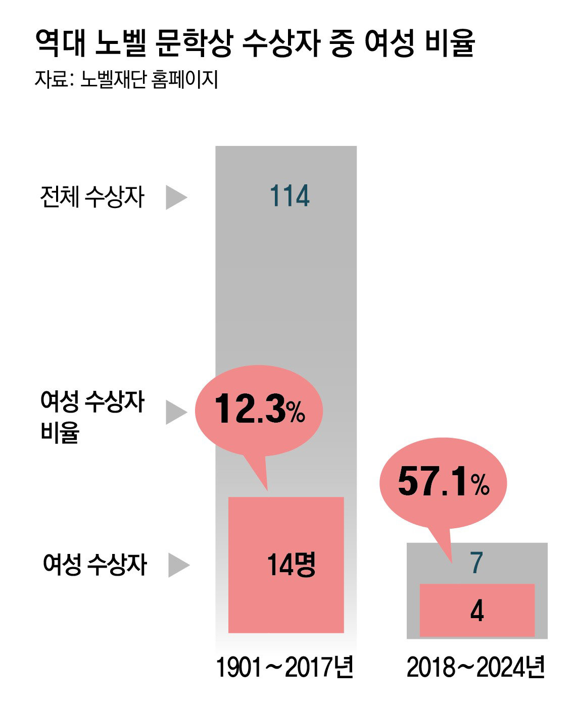 “2017년 스웨덴 한림원의 내부 성추문으로 2018년 시상이 취소된 적이 있다. 이후 한림원은 여성 위원 비율을 높이고 투명성을 강화해왔다. 현재 ‘문학위원회’도 남성 2명, 여성 3명으로 여성이 더 많다. 2019∼2024년 수상자 6명 가운데 여성은 3명으로 정확히 절반이란 점도 눈길을 끈다. 성별 순서도 남-여-남-여-남-여로 이어졌다.”