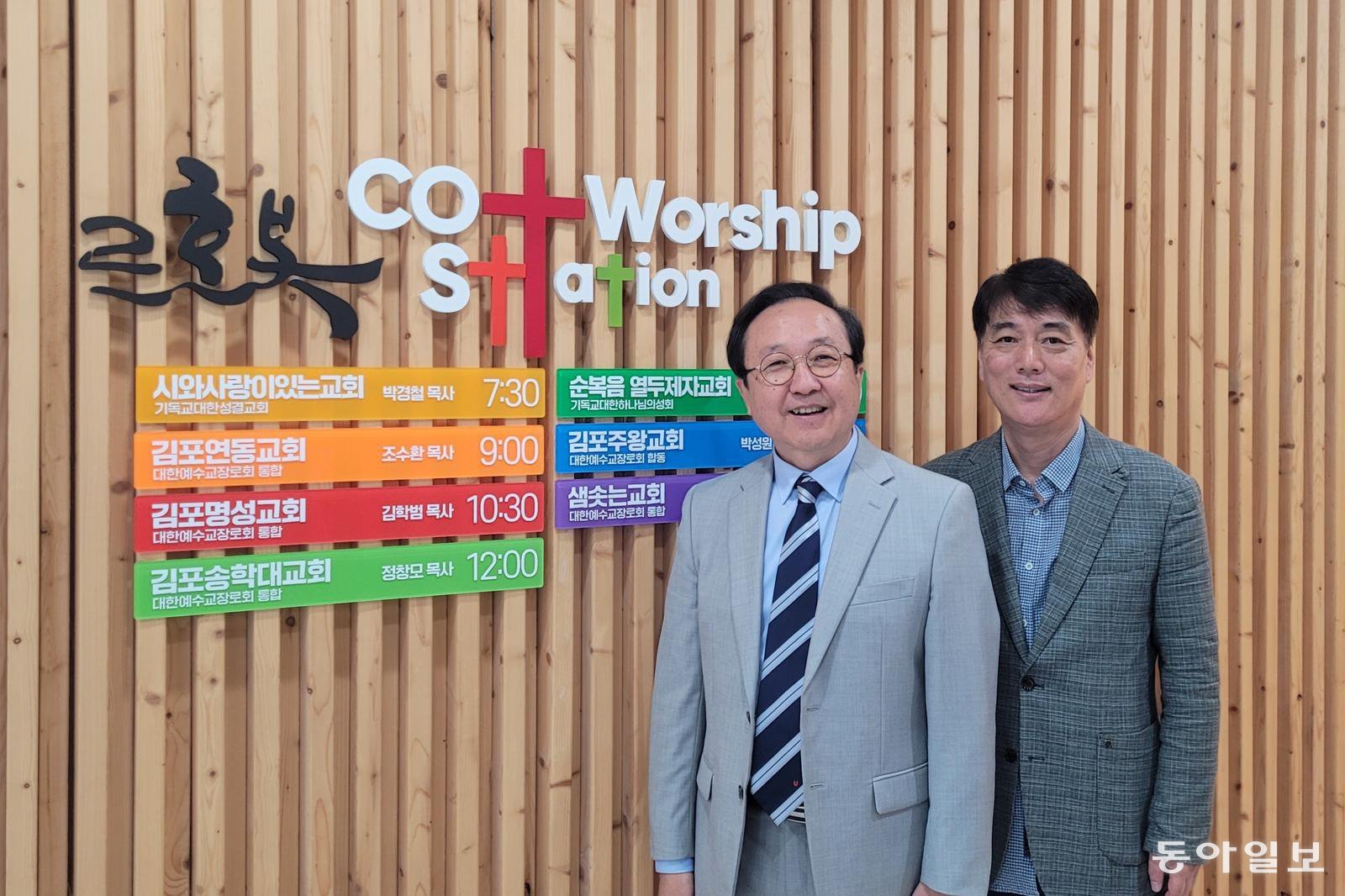 경기 김포 르호봇 코워십 스테이션에서 공유교회에 대해 설명하고 있는 김학범 목사(왼쪽)와 김인홍 어시스트 미션 사무총장. 김 목사는 “공유교회는 작은 교회들이 교회 운영에 드는 막대한 비용과 행정 부담에서 벗어나 사역 등 교회 본연의 활동에 집중하는 데 큰 도움을 준다”며 “물리적 공간은 작지만 에너지는 어느 교회 못지않게 크고 충만하다”고 말했다. 김포=이진구 기자 sys1201@donga.com
