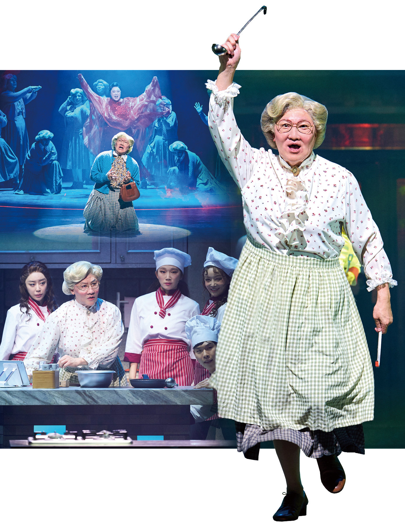 뮤지컬 ‘미세스 다웃파이어’에서 이혼 당한 다니엘은 유모 미세스 다웃파이어로 변장해 세 자녀를 돌보지만 상황이 점점 꼬이며 진실을 말해야 할 순간이 다가오자 고뇌한다.(위 사진). 아래 사진은 요리법을 익히는 다니엘. 샘컴퍼니 스튜디오선데이 제공
