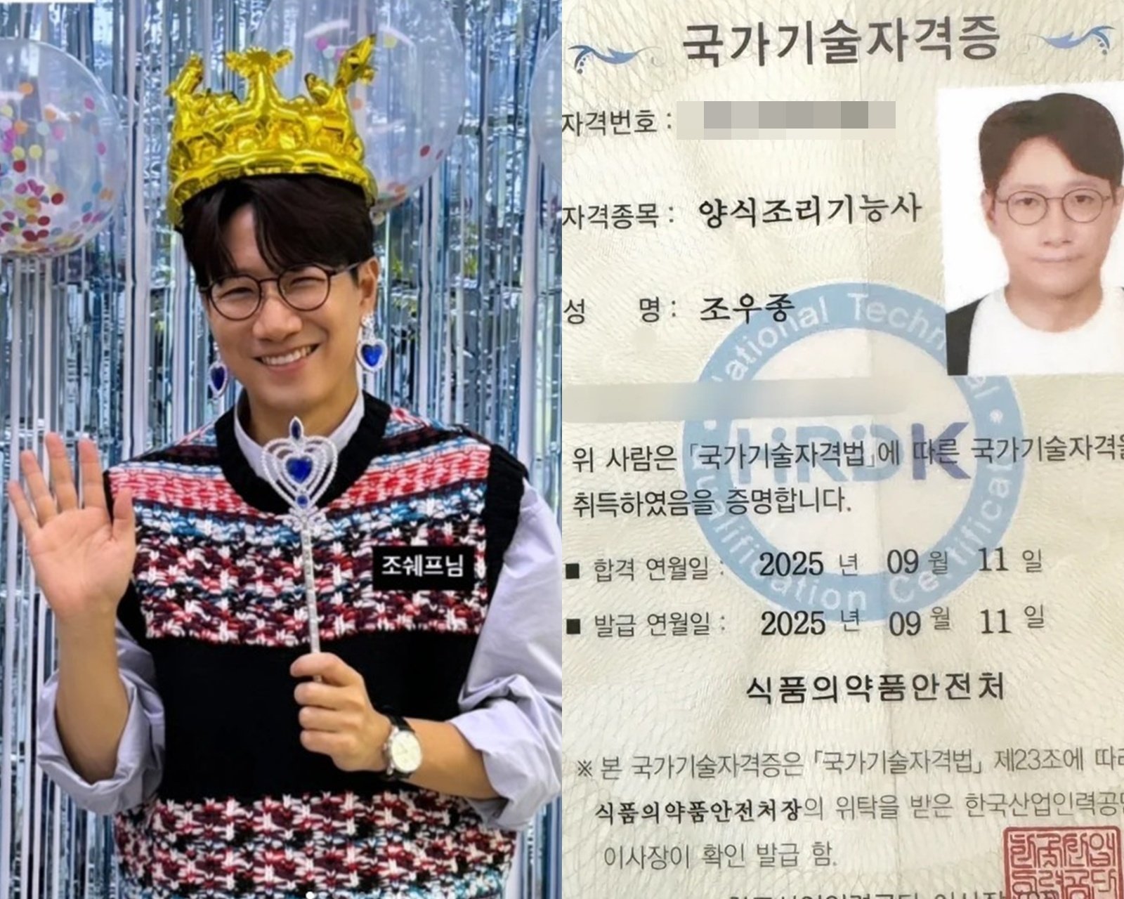 조우종은 해당 게시글과 함께 왕관을 쓰고 환하게 웃고 있는 사진을 게재했다. 또 다른 사진에는 요리에 집중하고 있는 조우종의 모습과 자격증이 담겨 눈길을 모았다.
