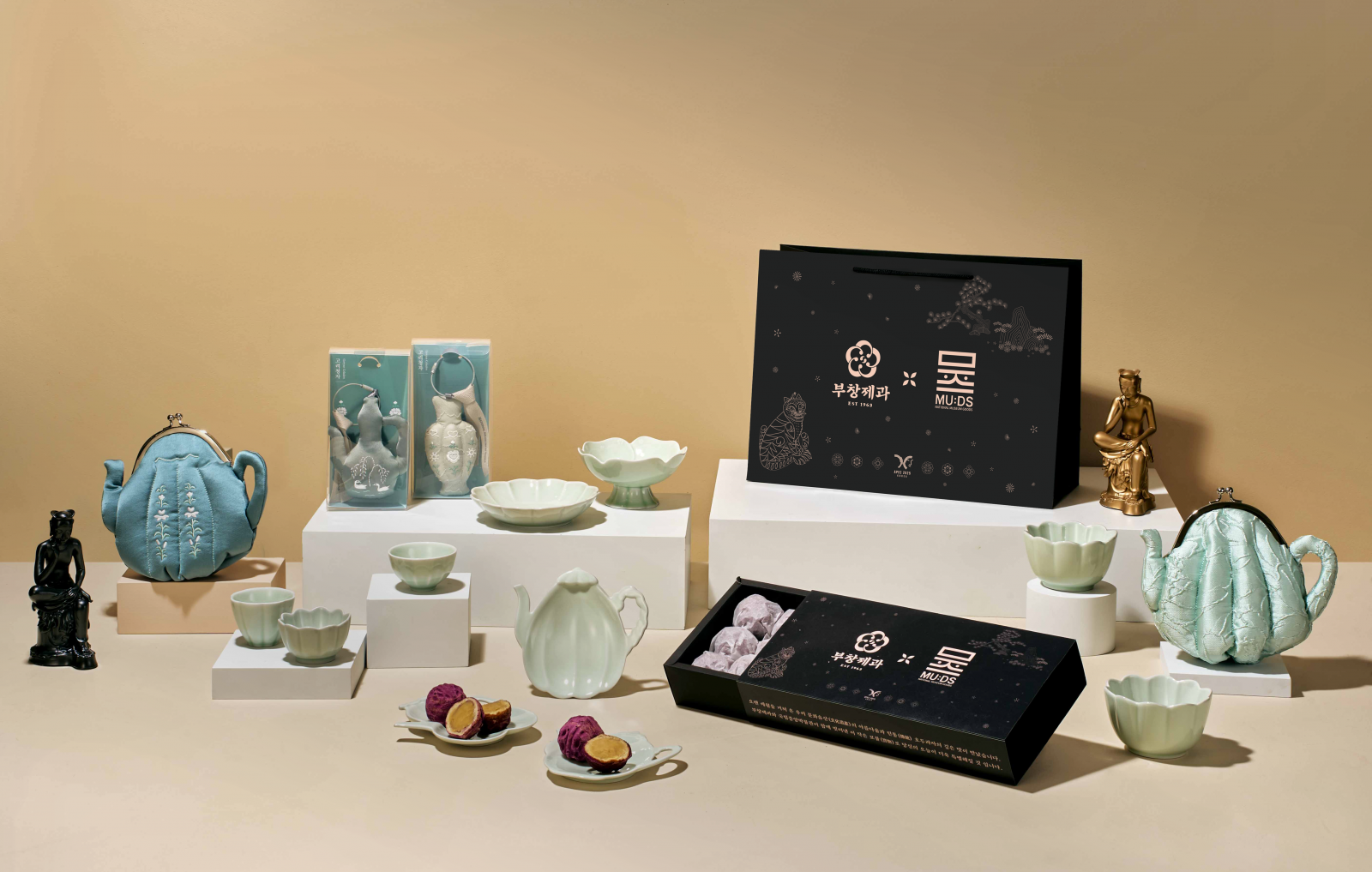 한정판 구성에는 ‘신라의 미소 파우치’, ‘호랑이 쟁반’, ‘청자 키링’, ‘청자 잔 세트’ 등 뮷즈의 대표 상품이 포함됐다. 부창제과는 이번 협업을 기념해 가을 시즌 한정 신제품인 ‘자색 꿀고구마 호두과자 선물세트’도 새롭게 선보였다. 고구마의 달콤함과 호두의 고소한 풍미가 어우러진 이 제품은 팝업 기간에만 판매될 예정이다.