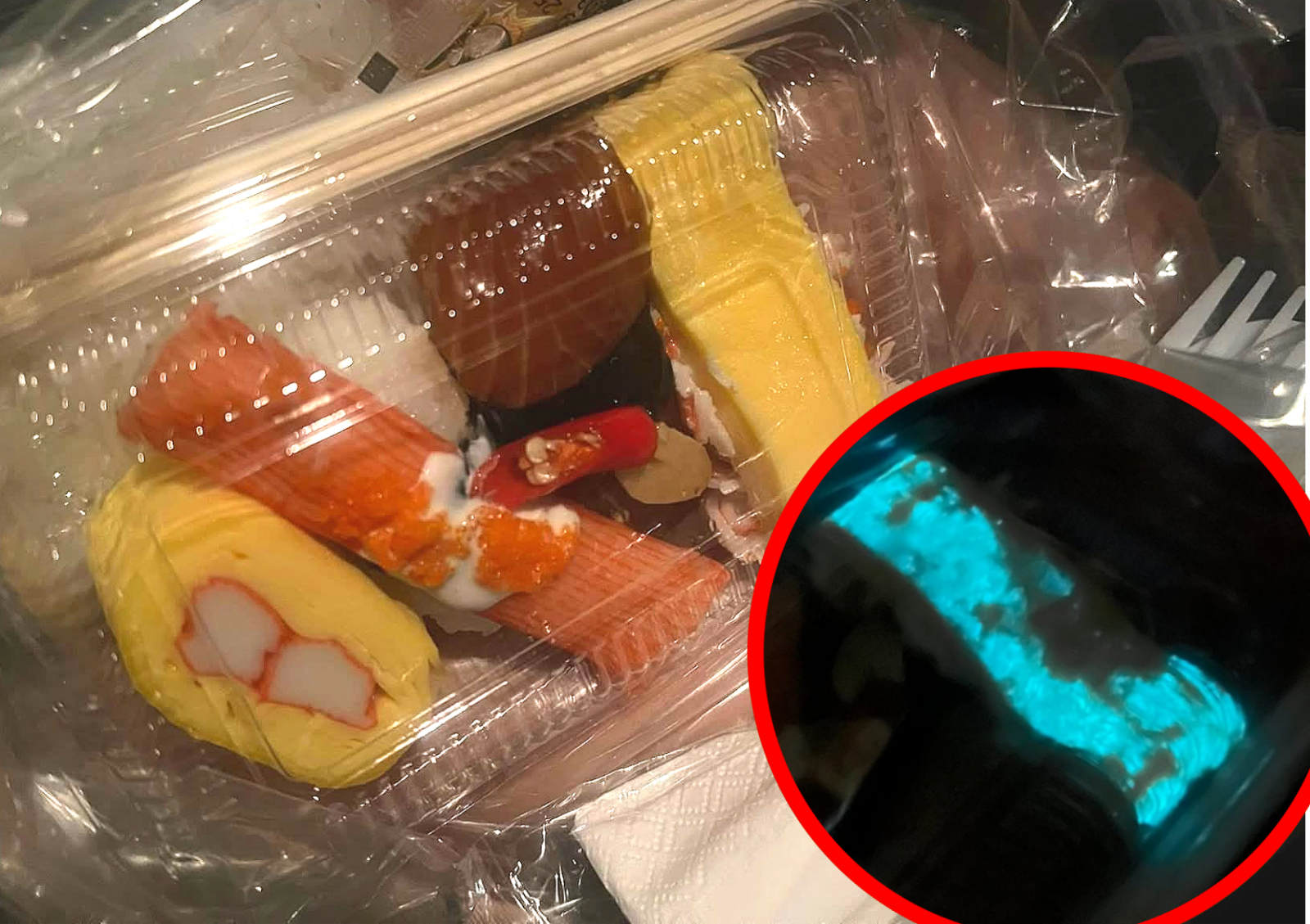 태국의 한 레스토랑에서 판매한 초밥이 어둠 속에서 푸른빛을 내는 모습이 포착돼 논란이 일고 있다. 전문가들은 “자연 발광 현상은 음식이 부패했다는 신호일 수 있으며, 식중독 위험이 높다”고 경고했다.