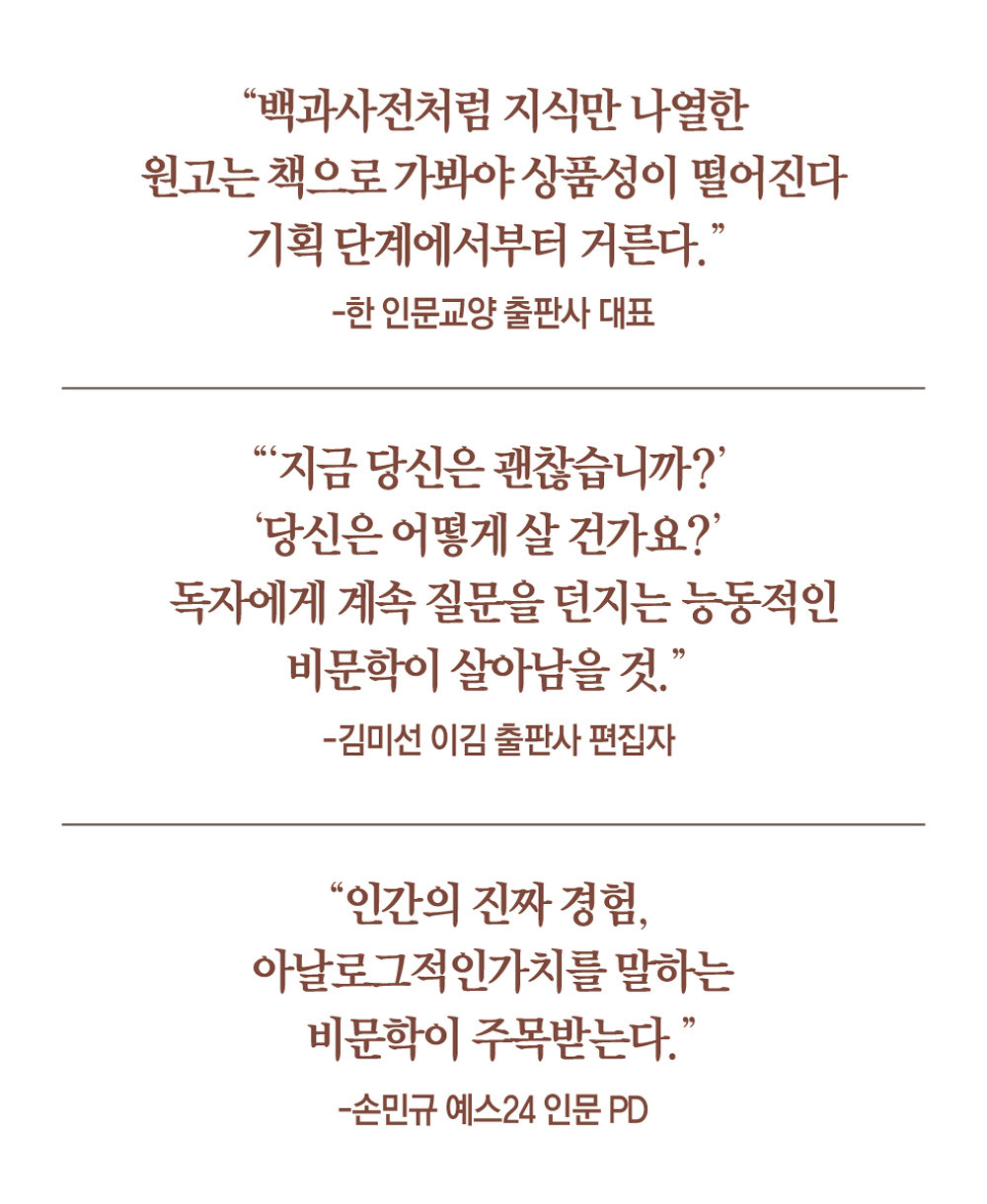 이김 출판사의 김미선 편집자는 “과거엔 비문학의 효용 가치가 지식 습득에 치중돼 있었다면, 지금은 인간다움과 새로운 나의 발견으로 무게추가 옮겨지고 있다”며 “앞으로도 독자에게 계속 질문을 던지는 ‘능동적인’ 책이 살아남을 것”이라고 내다봤다.