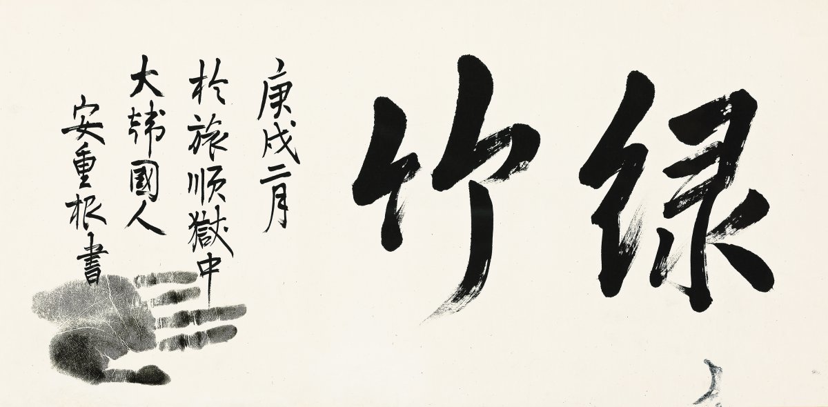 이들 모자가 지난달 경매에서 일본 소장자로부터 낙찰받아 고국으로 환수한 안 의사 유묵 ‘녹죽(푸른 대나무)’의 모습. 이상현 대표 제공