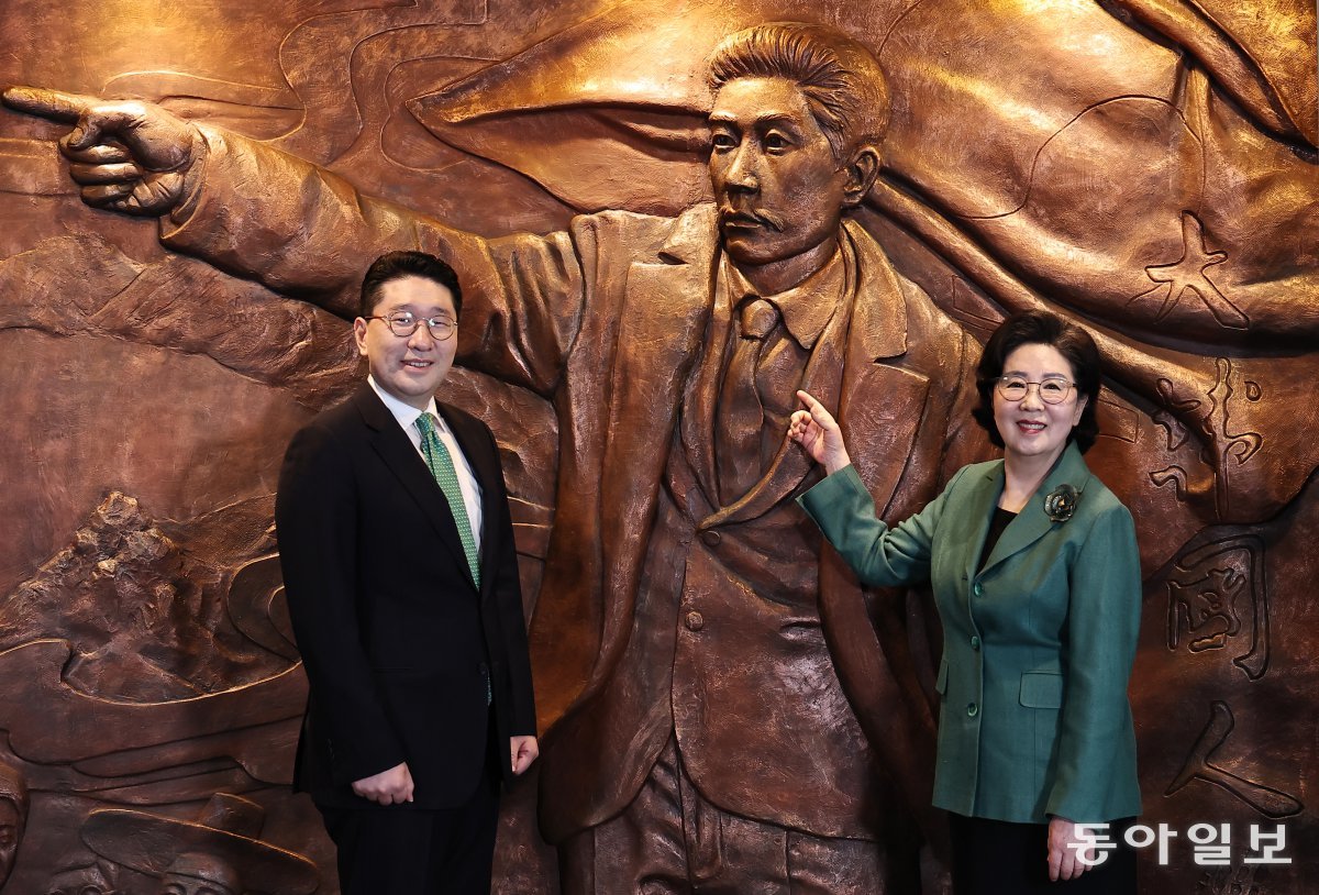 구혜정 여사(오른쪽)와 아들 이상현 ㈜태인 대표가 8일 서울 중구 안중근의사기념관에서 인터뷰를 마친 뒤 안 의사 부조 벽화 앞에서 사진 촬영을 하고 있다. 홍진환 기자 jean@donga.com