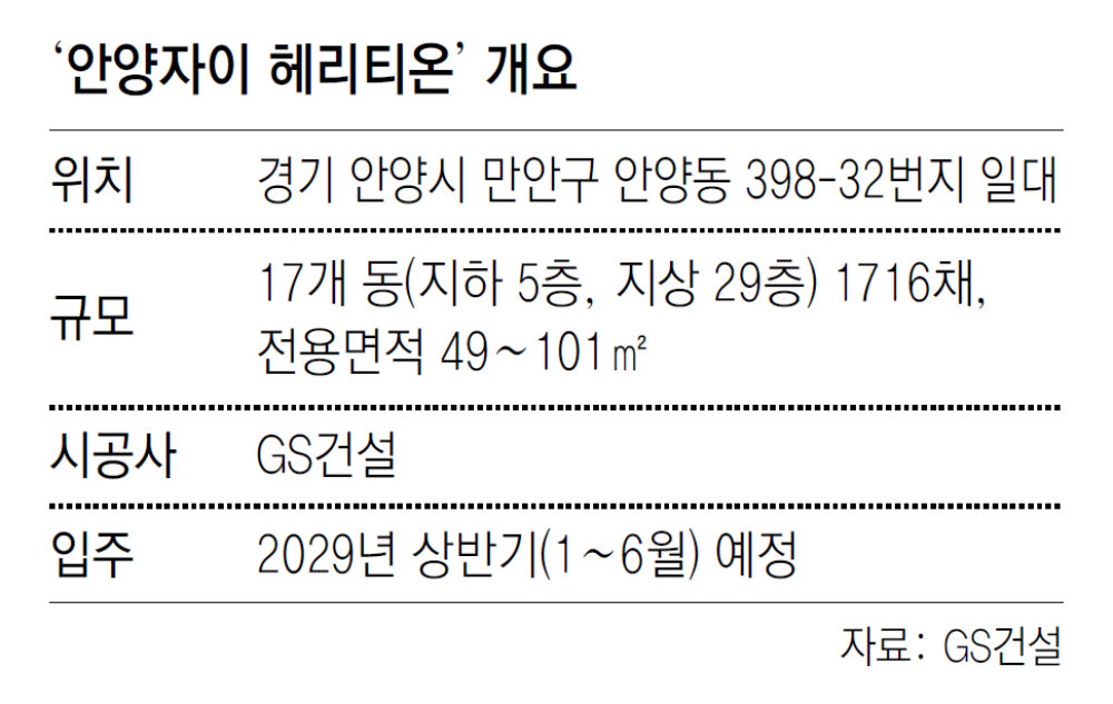 GS건설은 경기 안양시 만안구 안양동 일원에 들어서는 ‘안양자이 헤리티온’을 다음 달 분양할 예정이라고 10일 밝혔다.