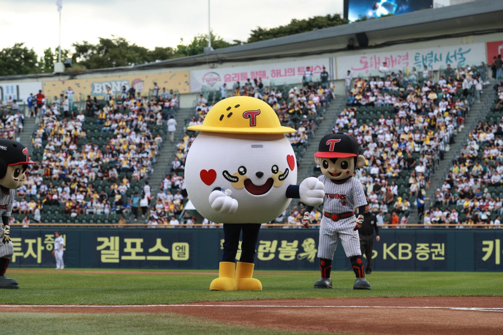 농식품부의 농촌관광 마스코트 촌식이가 지난 20일 LG트윈스 홈경기에서 시구자로 나섰다. 한국농어촌공사 제공