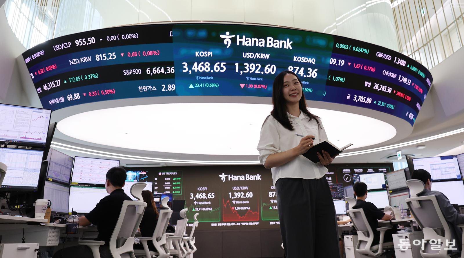 코스피가 삼성전자 강세와 뉴욕 증시의 역대 최고치 행보에 힘입어 사상 최고치를 경신한 가운데 22일 서울 중구 하나은행 딜링룸에 코스피 지수가 표시되어 있다. 홍진환 기자 jean@donga.com