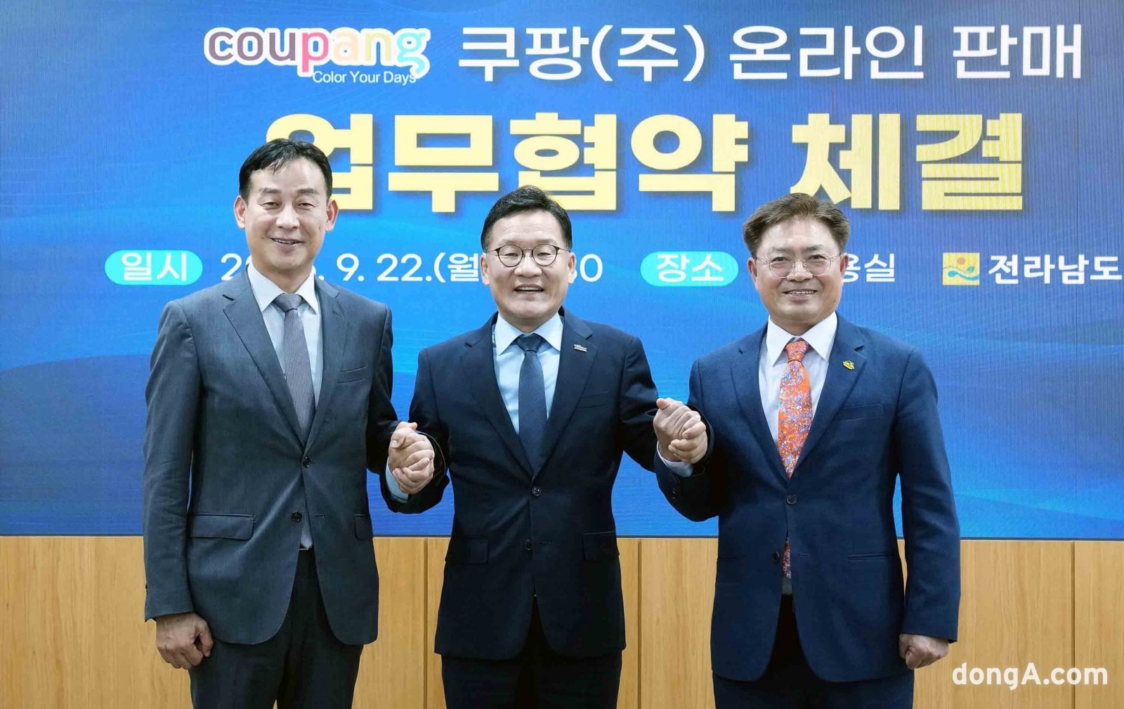 (왼쪽부터)강위원 전라남도 경제부지사, 민병기 쿠팡 정책협력실 부사장, 한승주 전라남도상인연합회장이 전통시장 온라인 판로 확대를 위한 업무협약을 체결한 뒤 기념촬영을 하고 있다.