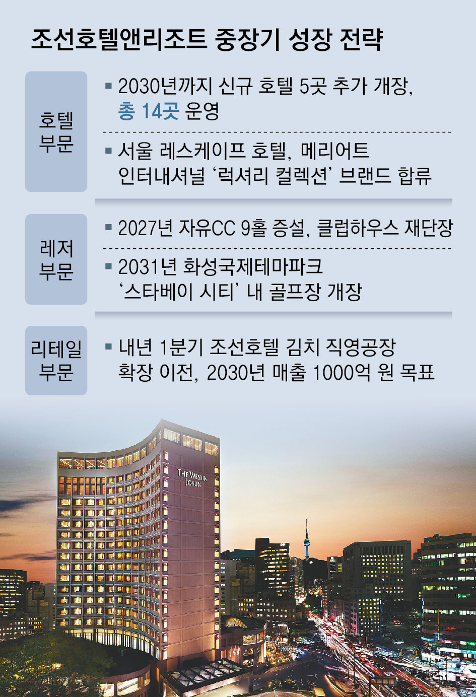 조선호텔앤리조트는 호텔 본업에서 축적한 경쟁력을 레저와 리테일 사업으로 확장하고 있다. 레저 부문에선 회원제 골프장인 자유컨트리클럽을 2027년까지 9홀 증설하고, 클럽하우스를 전면 재단장해 프리미엄 골프장으로 개선할 계획이다. 2031년에는 화성국제테마파크 ‘스타베이 시티’ 내 신규 골프장도 문을 열 예정이다.