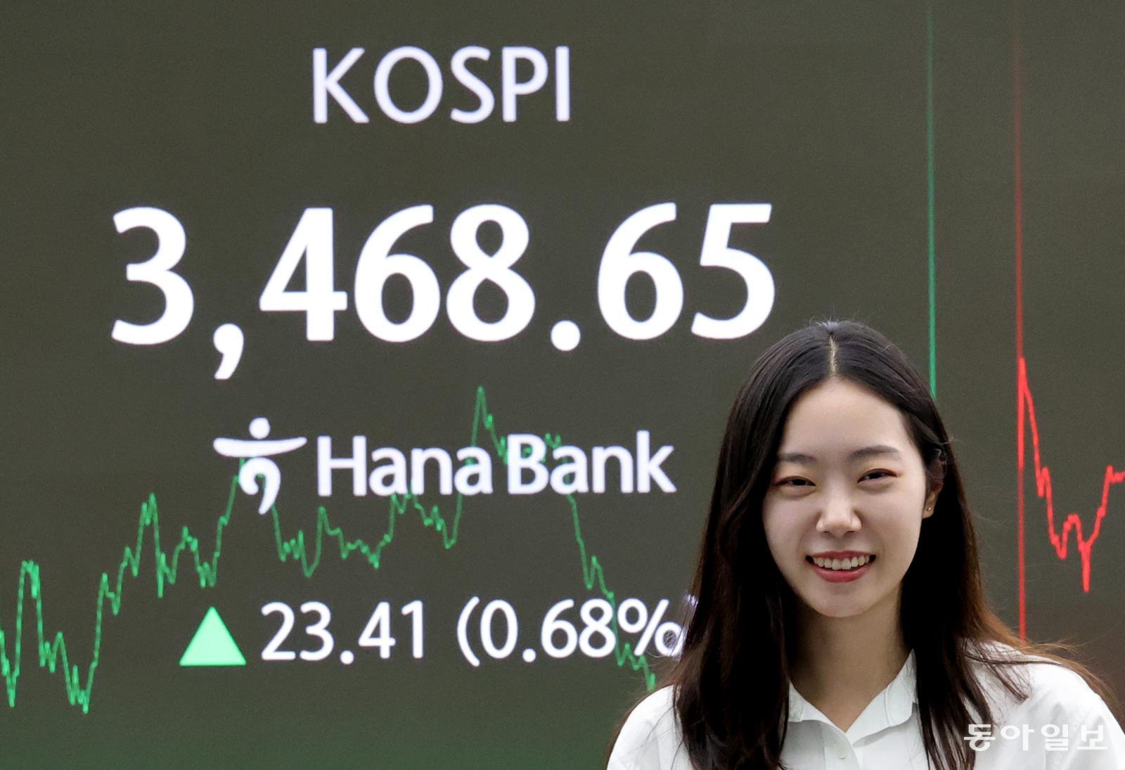 22일 서울 중구 하나은행 본점 딜링룸 시황판에 코스피 종가가 표시돼 있다. 이날 장중 한때 3,482.25까지 오른 코스피는 장중과 종가 모두 사상 최고치를 경신했다. 홍진환 기자 jean@donga.com