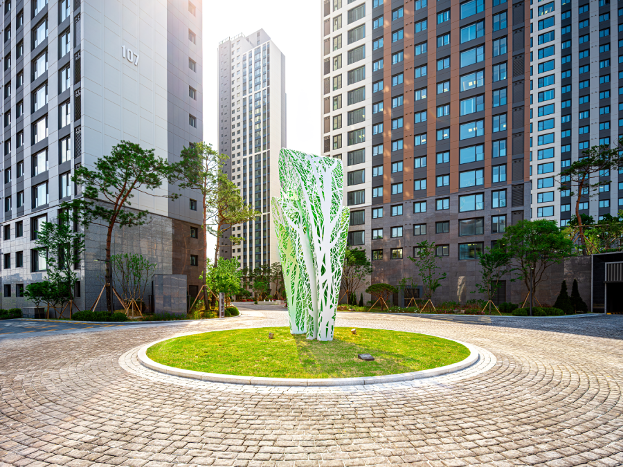 경남 김해 ‘김해율하 더스카이시티 제니스&프라우’에는 이정근 작가의 작품이 단지 문주 앞에 배치돼 입주민과 방문객이 단지에 들어서는 순간부터 예술적 감성을 체감할 수 있도록 했다.