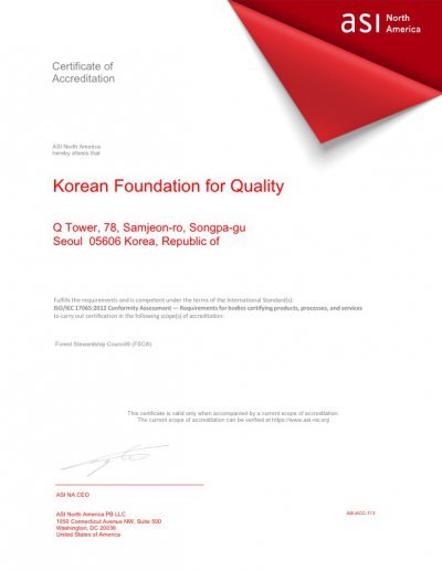 (재)한국품질재단(이사장 정기승)은 지난 16일 국제산림관리협의회(FSC, Forest Stewardship Council)로부터 연계관리(CoC, Chain of Custody) 인증기관으로 공식 인정을 받았다고 밝혔다.