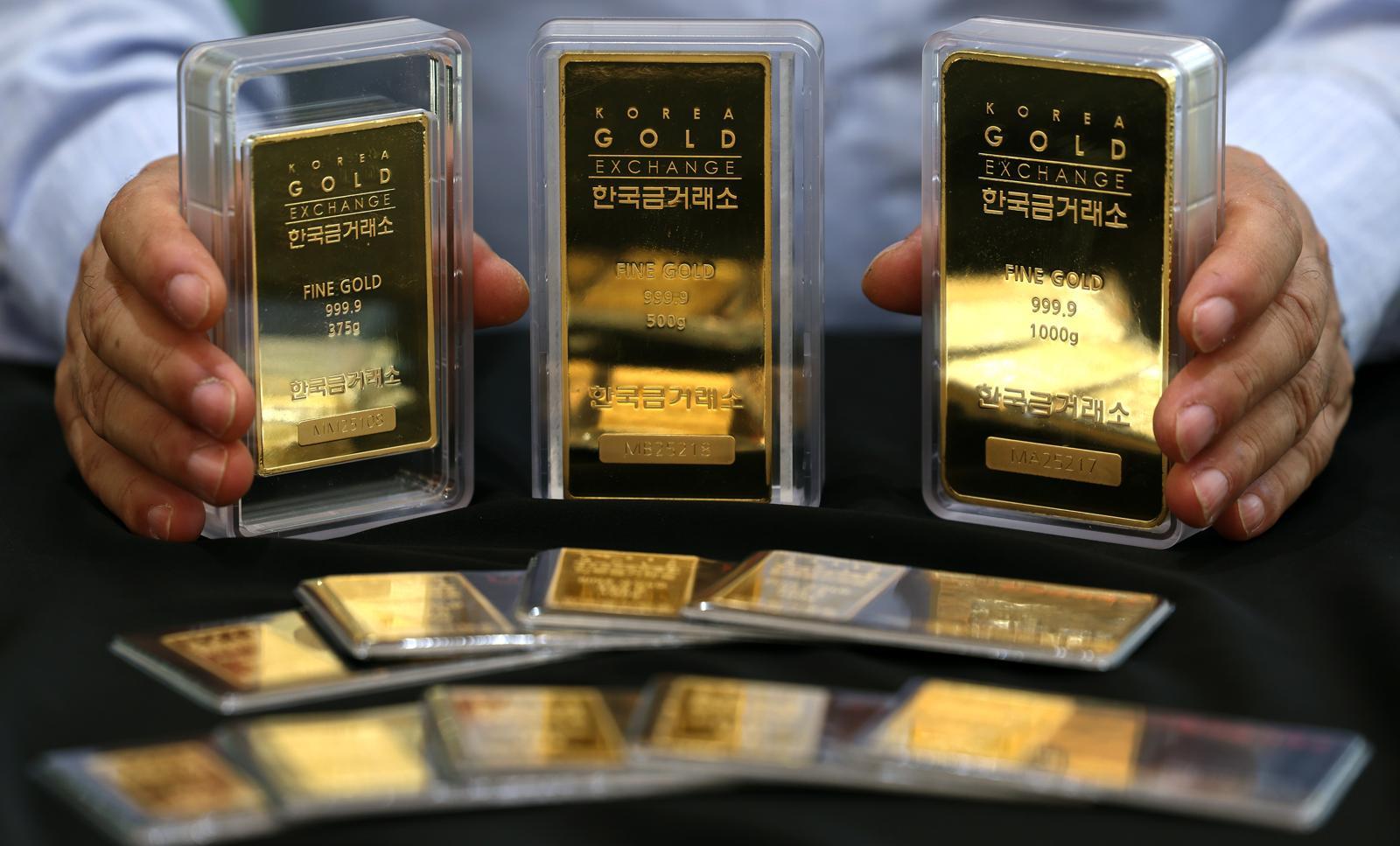 국제 금값이 다시 한 번 사상 최고치를 경신한 23일 서울 종로 한국금거래소에서 직원이 골드바를 내보이고 있다. 도널드 트럼프 행정부의 관세 정책이 불러온 글로벌 경제 불확실성과 미 연방준비제도(Fed·연준)의 금리 인하 재개가 맞물리며 이날 금 선물 및 현물 가격 모두 사상 최고치 기록을 경신했다. 2025.9.23/뉴스1