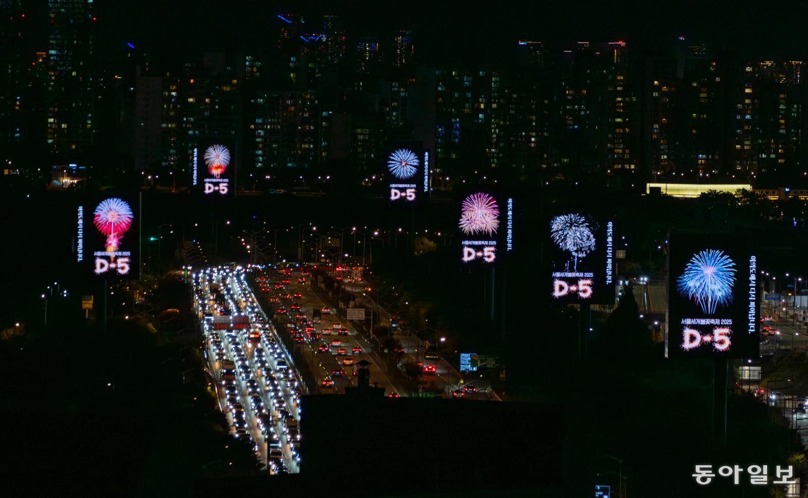 22일 서울 올림픽대로 여의도 구간에 1988년 서울올림픽 당시 불꽃쇼 사진 등 ‘서울세계불꽃축제 2025’ 관련 미디어아트가 전시되고 있다. 국내 최대 규모의 불꽃 축제인 서울세계불꽃축제는 27일 서울 여의도에서 열린다.