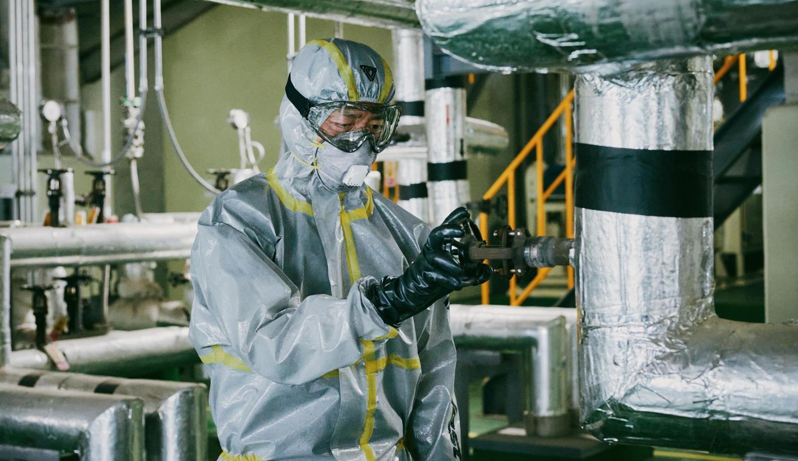 코오롱인더스트리 FnC 구미공장에서 작업자가 워크웨어 브랜드 ‘볼디스트’의 내화학복을 입고 있다. 볼디스트는 25, 26일 서울 광화문광장에서 열리는 ‘2025 리스타트 잡페어’에서 방염, 내화학, 베임 방지, 고가시성, 냉감, 근골격 보호 등 대표 6대 안전 제품군 작업복을 전시한다. 코오롱FnC 제공