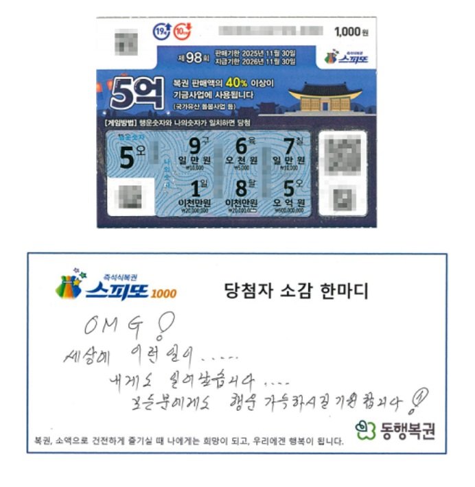 복권 구입 직후 가게에서 당첨 확인을 하던 그는 처음에는 5000원 당첨인 줄 알고 넘기려던 순간, ‘천’이 아니라 ‘억’이라는 글자를 보고 깜짝 놀랐다.