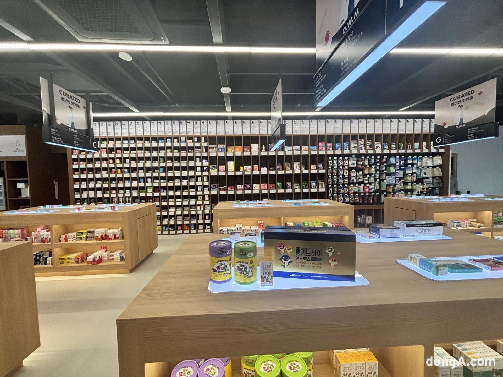 옵티마웰니스뮤지엄 전경. 황소영 기자 fangso@donga.com 문을 열고 들어서면 마트형 대형 약국의 삐죽삐죽한 진열대와는 전혀 다른 풍경이 펼쳐진다. 카테고리별로 정돈된 진열대는 마치 전시관처럼 차분하고 여유 있게 배치돼 있고 조명과 인테리어는 소비자가 서서 비교하고 고를 수 있도록 안정적인 분위기를 조성한다. 제품은 3000여 종에 달한다. 의약품, 건강기능식품, 더마 화장품, 라이프스타일 제품까지 웰니스 전반을 아우른다. 처방전이 필요한 전문의약품은 취급하지 않고 있으며 일반의약품은 매장의 70%~80%, 건강기능식품과 식품, 뷰티군이 나머지를 차지하고 있다.