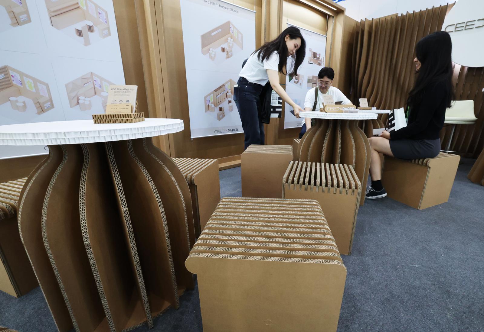 24일 오전 서울 강남구 코엑스에서 열린 ‘2025 대한민국 환경·사회·투명 경영(ESG) 친환경대전’에서 씨드페이퍼 부스를 찾은 관람객들이 골판지보드와 허니콤보드로 만든 가구를 살펴보고 있다. 26일까지 열리는 전시회에서는 플라스틱 재활용 등 녹색기술과 산업을 한눈에 볼 수 있다.