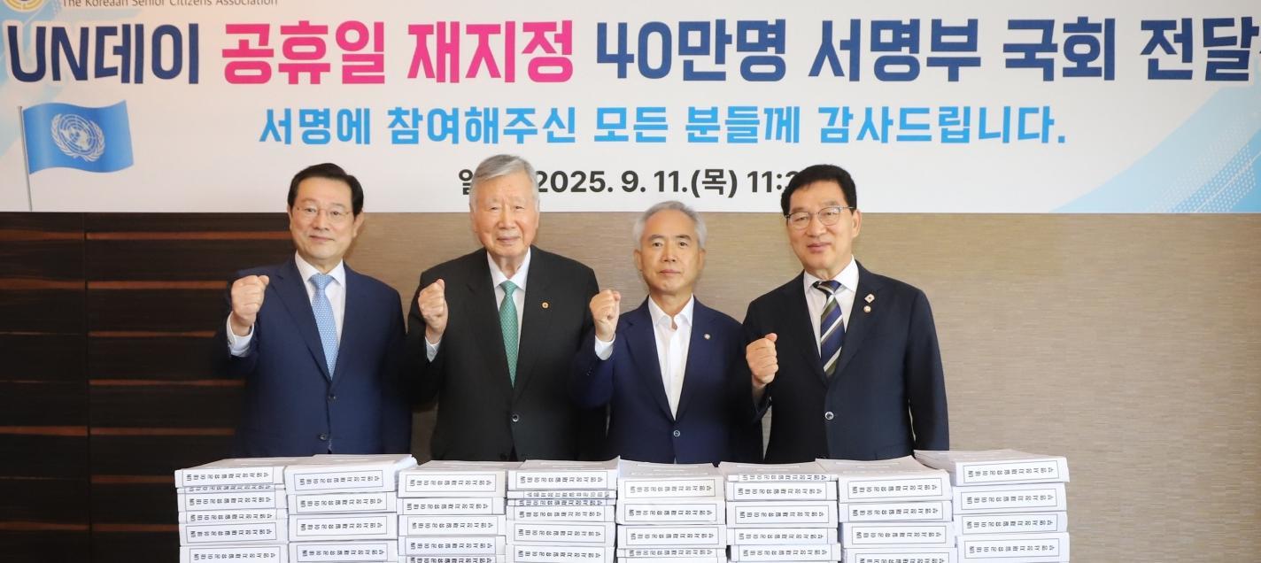 이 회장은 이날 신정훈 행정안전위원회 위원장, 양부남 더불어민주당 의원을 만나 40만 명이 동참한 ‘유엔데이 공휴일 재지정 서명부’를 전달했다. 이 회장은 올해 2월 부영그룹 시무식에서 대한민국의 장래와 후손들을 위해 유엔데이 공휴일 재지정을 주장해 관심을 모았다.
