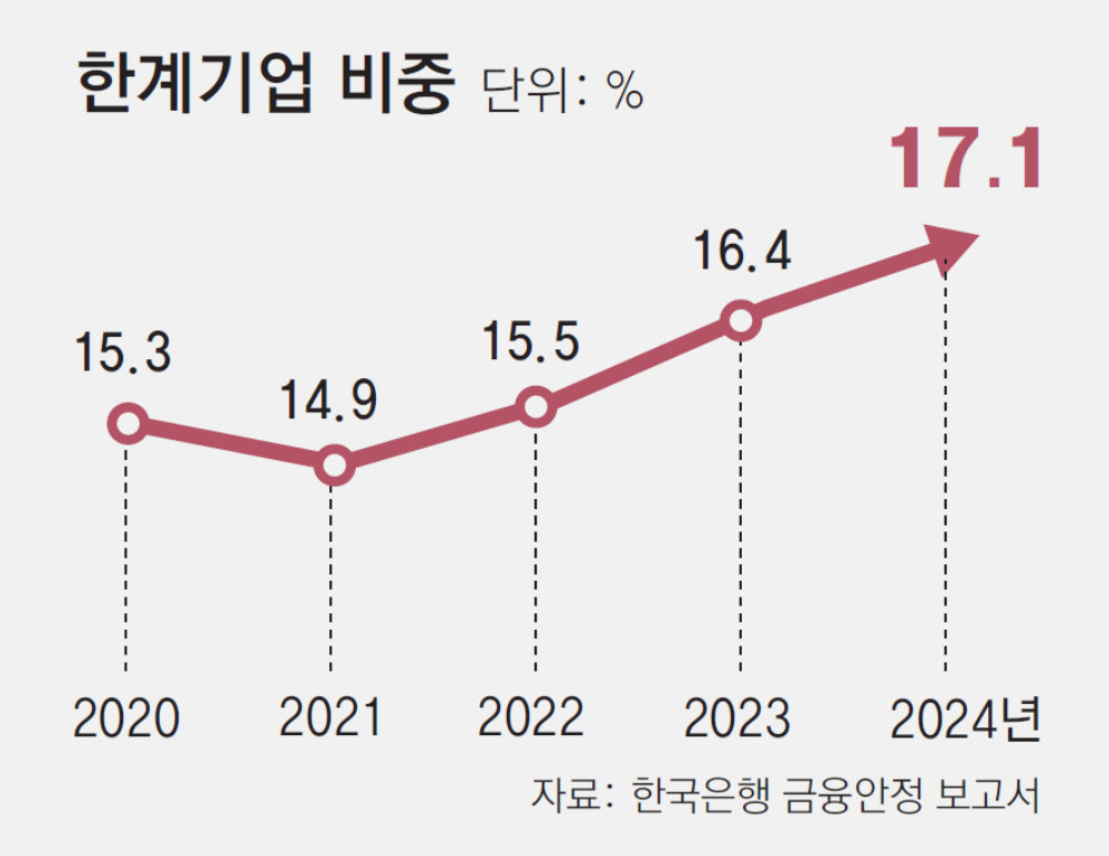 25일 한국은행 금융안정 보고서에 따르면 지난해 말 기준 전체 외부감사 기업 중에서 이자보상배율이 3년 연속 1을 밑돈 한계기업 비중은 17.1%다. 1년 전에 비해 0.7%포인트 상승했다. 2010년(11.4%) 이후 가장 높은 수준이다. 한계기업은 영업이익으로 이자비용조차 감당하지 못하는 기업을 뜻한다. 기업의 재무 상태가 부실해 존립 자체가 어렵다는 의미다. 한계기업이 늘면 경제의 활력이 떨어질 수 있다.