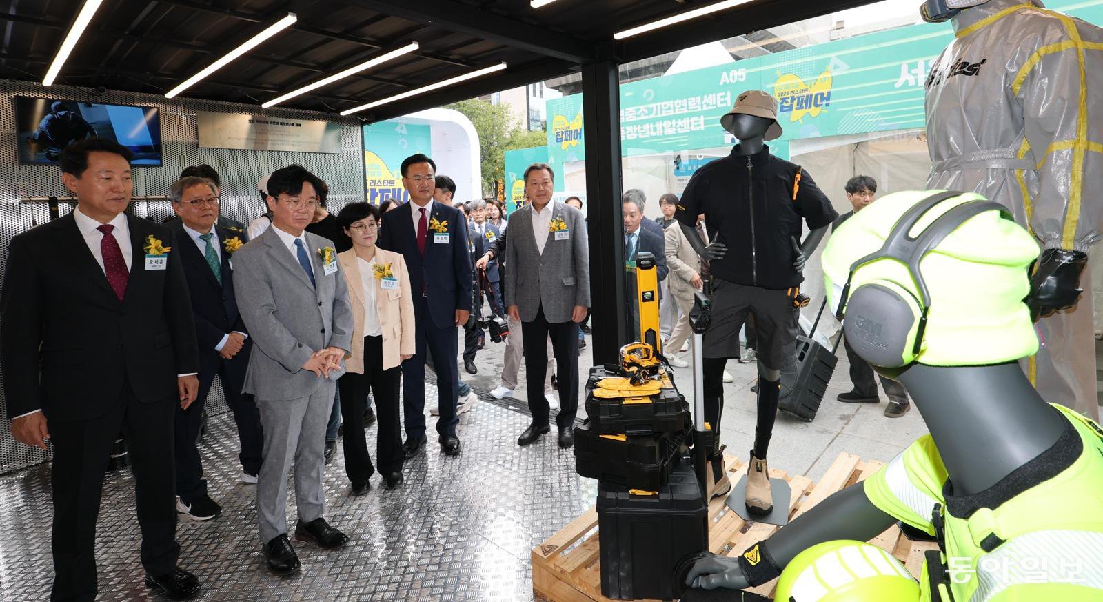 25일 ‘2025 리스타트 잡페어’에 마련된 ‘일자리안전특별관’을 찾은 주요 인사들이 코오롱인더스트리 FnC 부문의 작업복 브랜드 부스를 둘러보고 있다. 홍진환 기자 jean@donga.com