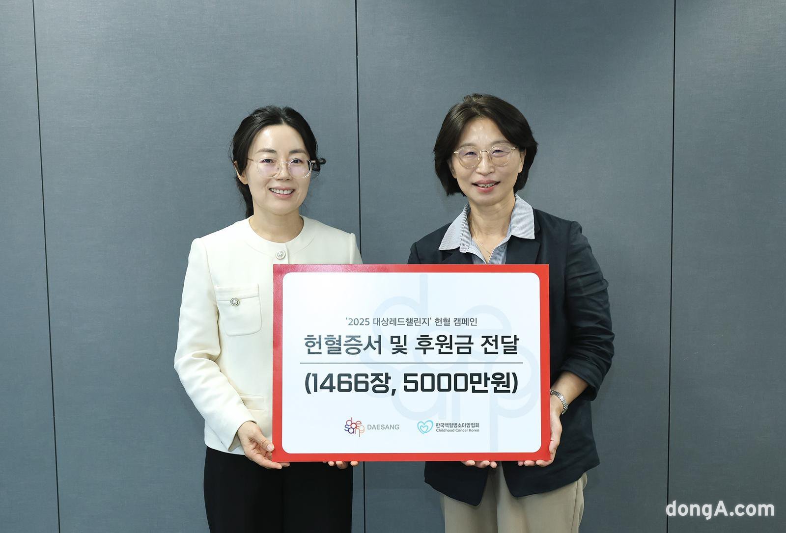 대상그룹은 26일 전 국민과 임직원이 함께한 헌혈 캠페인 ‘대상레드챌린지’를 통해 모은 헌혈증서 1466장과 5000만 원의 후원금을 한국백혈병소아암협회에 전달했다고 밝혔다. 전달식은 서울 종로구 대상 본사에서 진행됐다.