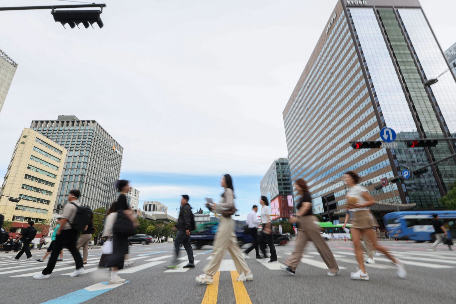일교차가 벌어지며 선선한 가을 날씨를 보인 23일 오전 서울 종로구 광화문 사거리에서 직장인들이 출근을 위해 이동하고 있다. 2025.09.23 [서울=뉴시스]