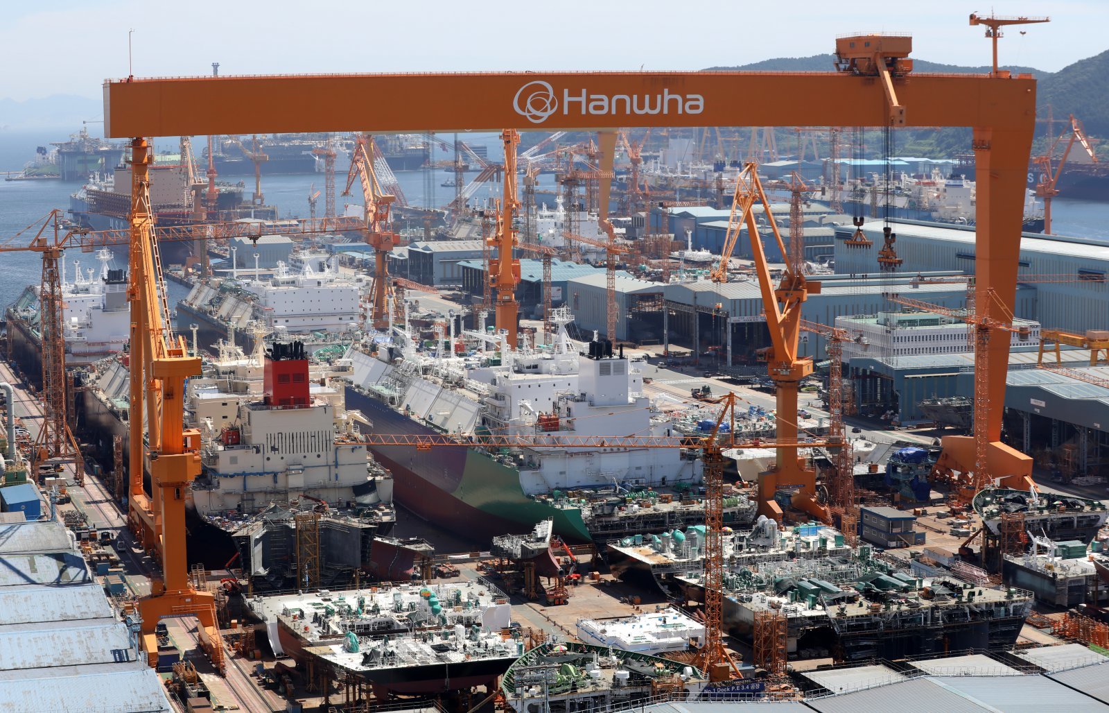 대미 수출 관세 인하와 조선업 투자를 골자로 한 한미 무역 협상이 타결된 31일 경남 거제시 아주동 한화오션 거제사업장에 대형 크레인이 보이고 있다.  2025.7.31/뉴스1