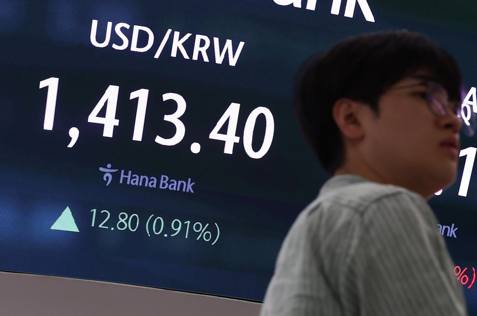 미국 경제지표 호조로 달러가 강세를 나타내면서 원·달러 환율이 넉 달 만에 장중 1410원대를 돌파한 26일 오후 서울 중구 하나은행 본점 딜링룸 전광판에 종가가 나오고 있다. 이날 원·달러 환율은 1410원을 돌파해 오름세를 보이고 있다. 뉴스1