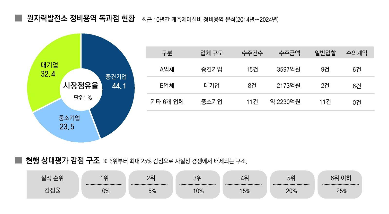 국가 에너지 안보의 핵심인 원자력발전소 정비 분야에서 심각한 독과점 현상이 벌어지고 있다. 구자근 국회의원(국민의힘)이 한국수력원자력(한수원)으로부터 제출받은 자료에 따르면 최근 10년간 원자력발전소 계측제어설비 정비용역 계약 34건 중 23건을 상위 2개 업체가 수주해 전체 물량의 약 70%를 독식한 것으로 나타났다.
