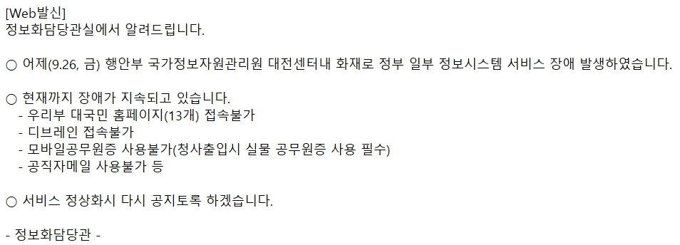 중앙부처와 산하기관은 서버를 개별로 운영하지 않고 행정안전부 산하 통합 시스템(G-클라우드)에 의존하고 있다. 이에 따라 중앙부처와 산하기관 홈페이지 접속이 중단된 상태다.