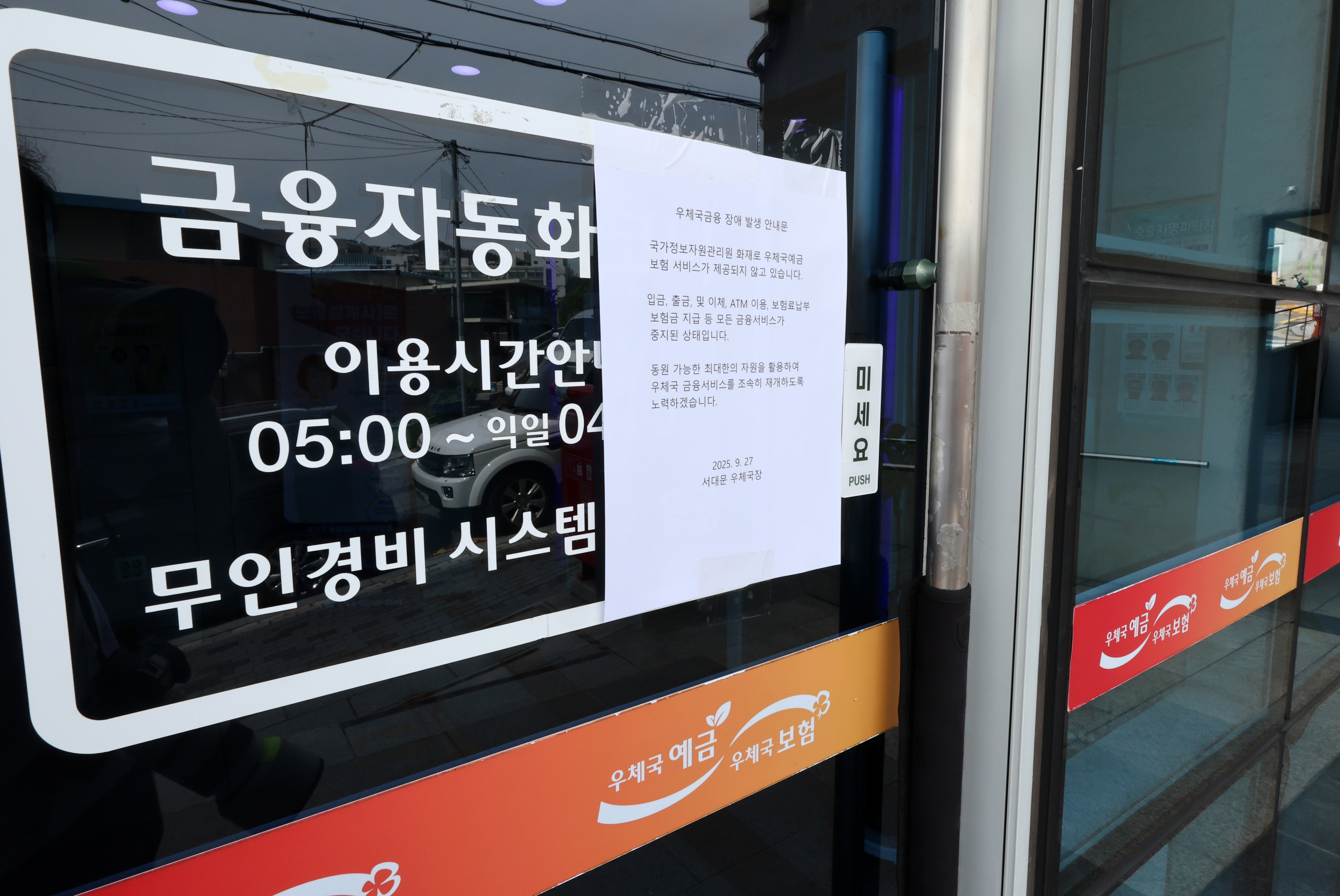 국가정보자원관리원(국정자원) 화재로 우체국, 정부24 등 주요 업무시스템이 중단된 27일 서울 서대문구 서대문우체국에 우체국금융 장애 발생 안내문이 게시되어 있다. 2025.09.27 서울=뉴시스
