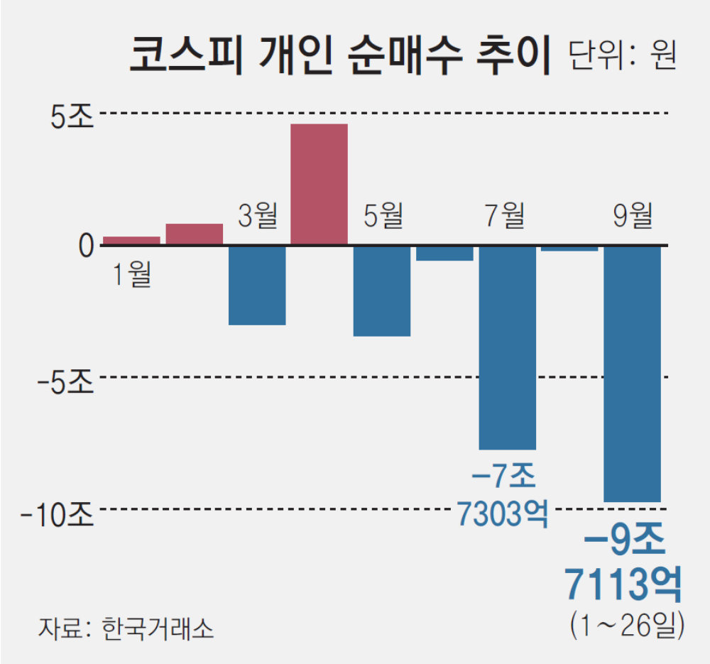 28일 한국거래소에 따르면 올해 초부터 이달 26일까지 개인투자자들은 코스피에서 18조9854억 원을 순매도했다. 이 중 17조6580억 원(93%)을 3분기(7∼9월)에 팔아치웠다. 특히 이달 들어서만 9조7113억 원 순매도하면서 지난해 2월(8조4120억 원 순매도) 기록을 깨고 월별 최대 순매도 규모를 경신할 것으로 전망된다.