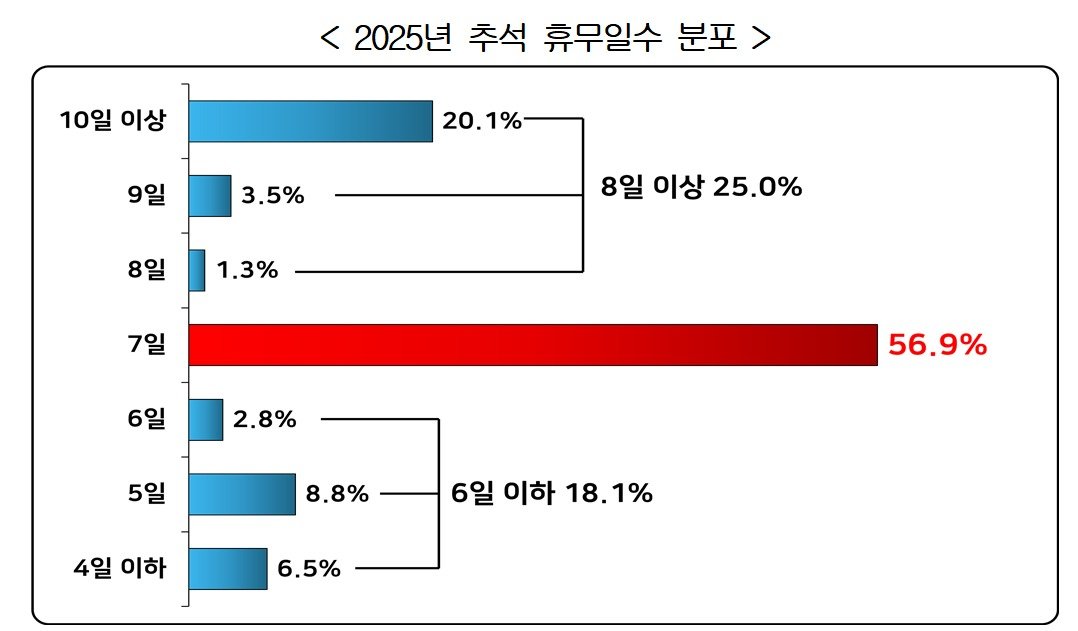 올해 추석 휴무를 실시하는 기업의 56.9%가 개천절부터 한글날까지 7일 동안 쉬는 것으로 나타났다. 열흘 이상 쉰다는 응답이 20.1%로 그 뒤를 이었다. 한글날에 이어 금요일인 다음 달 10일까지도 휴무일로 정한 경우 직후 주말까지 쳐 총 열흘을 쉬는 것으로 경총은 분류했다.