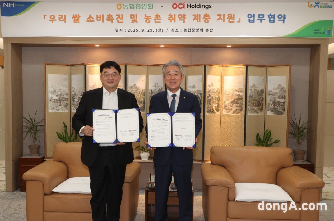 농협중앙회와 OCI홀딩스가 29일 우리 쌀 소비 촉진과 농촌 지역 내 어려운 이웃을 지원하기 위한 업무협약을 체결했다. 농협중앙회 본관에서 열린 이날 협약식에는 농협중앙회장과 OCI홀딩스 회장이 직접 만나 상호 협력 방안을 논의했다.