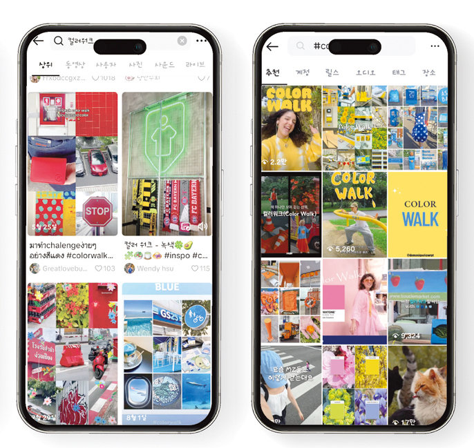 산책 메이트인 아이가 내민 스마트폰 속 SNS 피드가 알록달록했다. 특이한 점은 게시물마다 한 가지 색상에만 집중하고 있다는 것. 해외에서 시작해 국내 유행 중인 컬러 워크 챌린지는 한 색을 정해 찾으며 영상이나 사진으로 기록하는, 일종의 미션이 있는 산책법이다.