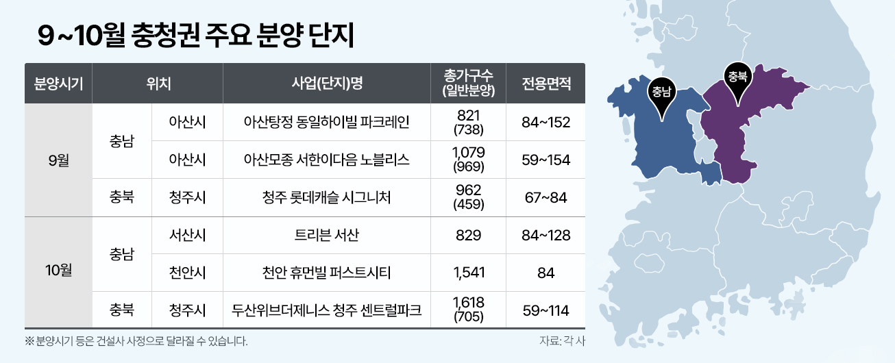 부동산시장 분석업체 부동산인포에 따르면 9월 말부터 10월까지 충청권에서는 총 8393가구가 분양될 예정이다. 이 중 일반분양 물량은 5870가구다.