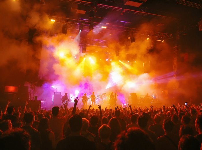 밴드 공연 무대에서 연주하는 뮤지션과 환호하는 관객들의 모습을 묘사한 이미지, 사진=한국벤처창업학회 제공