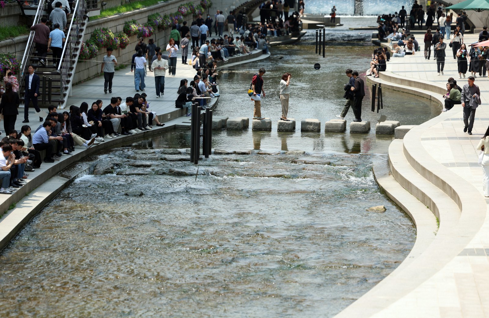 서울 청계천에서 직장인들이 점심시간을 이용해 그늘에서 휴식을 취하고 있다. 뉴스1