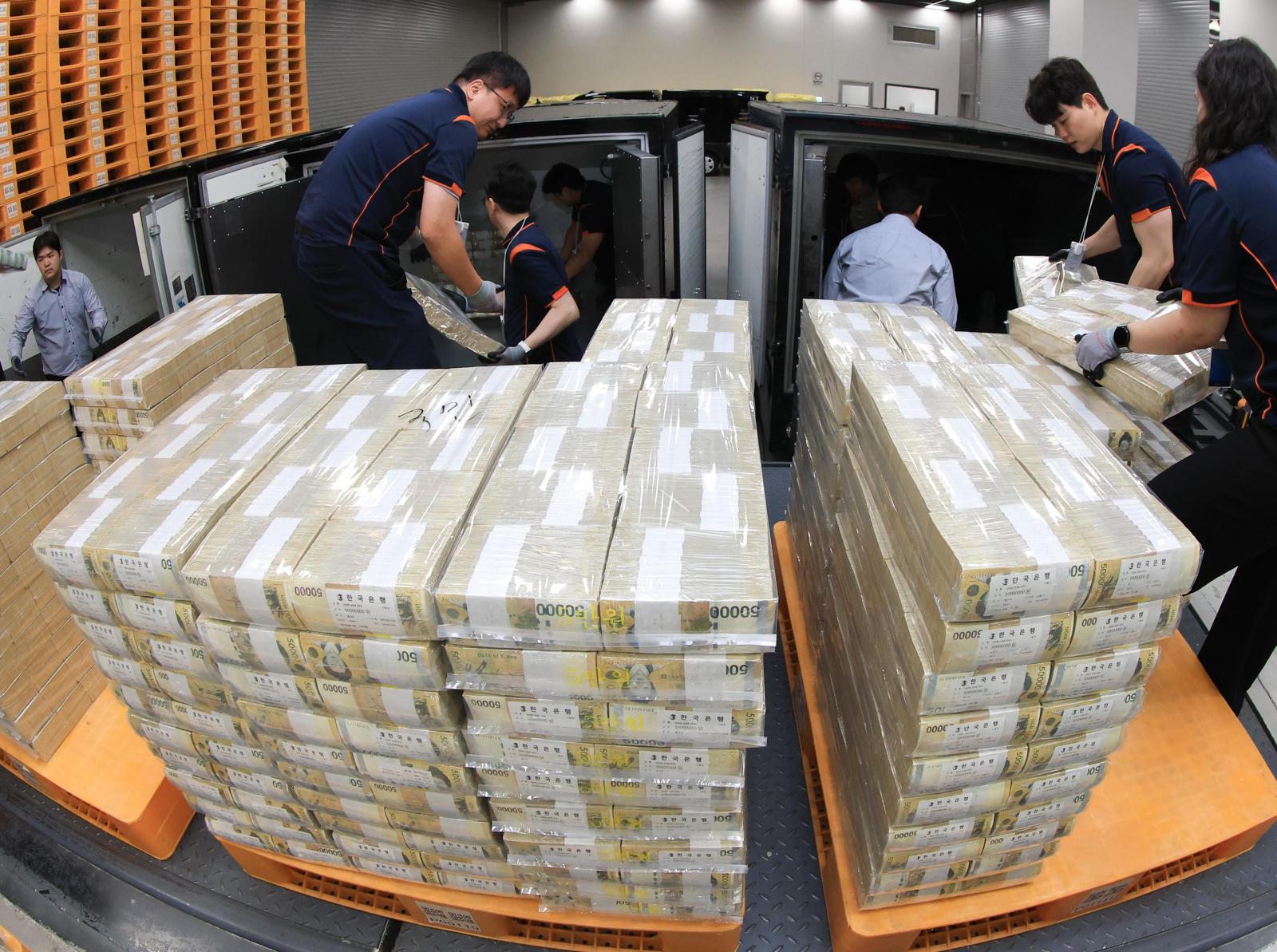 30일 서울 중구 한국은행 화폐수납장에서 현금 운송 관계자들이 추석을 앞두고 시중은행에 보낼 5만 원권 지폐를 트럭에 싣고 있다.