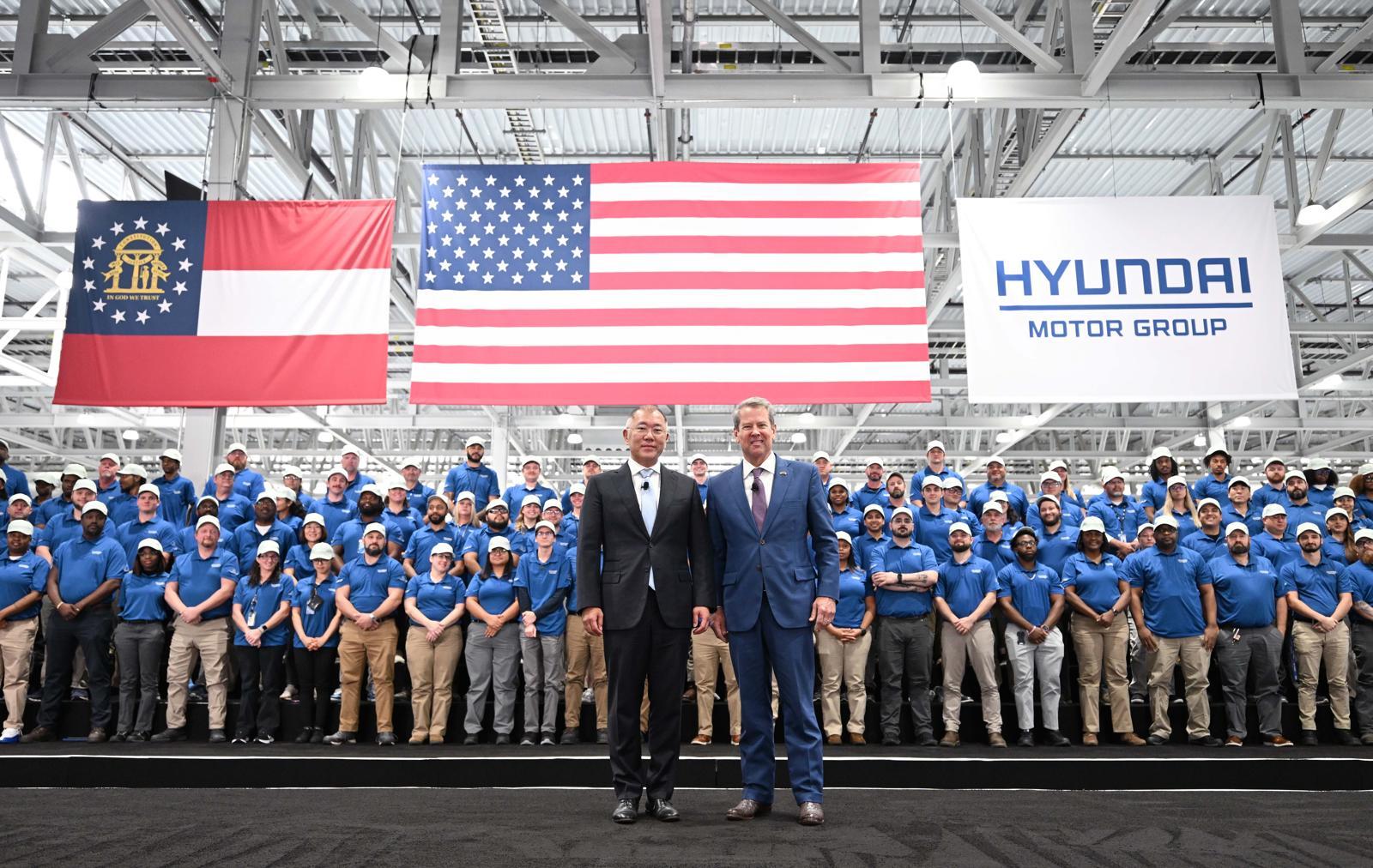 3월 미국 조지아주에서 열린 현대자동차그룹 메타플랜트 아메리카 준공식에서 정의선 현대차그룹 회장(가운데 왼쪽)과 브라이언 켐프 조지아 주지사가 기념사진을 촬영하고 있는 모습. 현대자동차 제공