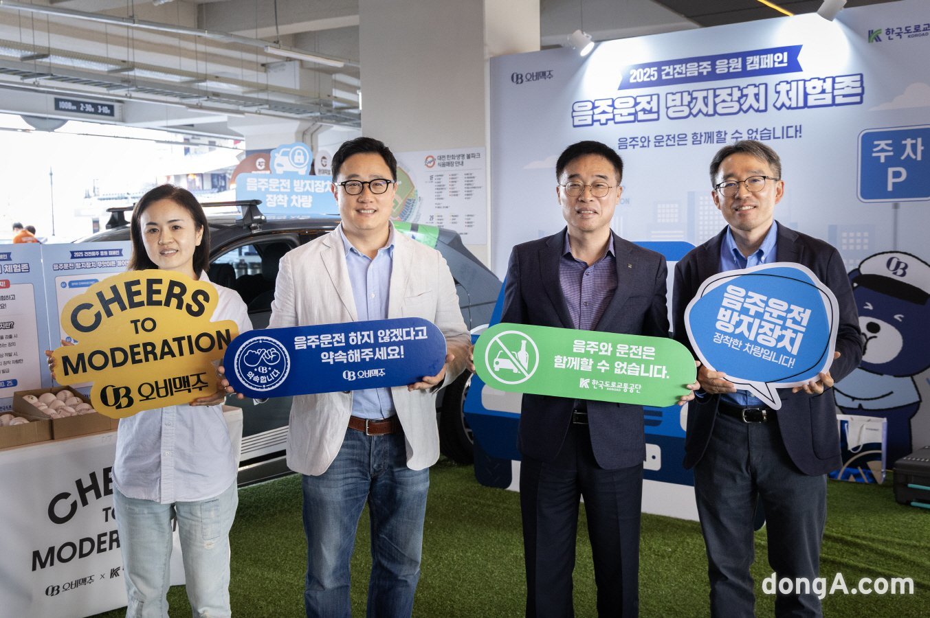오비맥주 정책홍보부문 구자범 수석 부사장(왼쪽에서 두번째)과 한국도로교통공단 이영재 혁신기획본부장(왼쪽에서 세번째)이 30일 대전 한화생명볼파크에서 열린 ‘건전음주 응원 캠페인’ 행사장에서 기념사진을 찍고 있다.
