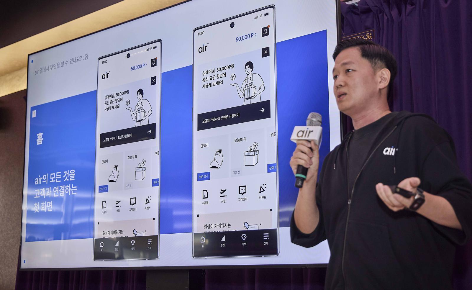 SK텔레콤은 꼭 필요한 핵심 기능과 심플한 요금제로 통신 미니멀리즘을 구현하고, 포인트 혜택을 더한 디지털 통신 브랜드 ‘에어(air)’를 론칭한다고 1일 밝혔다. 1일 서울 성동구 T팩토리에서 이윤행 SK텔레콤 air기획팀장이 자급제 전용 디지털 통신 서비스 ‘에어(air)’를 소개하고 있다. SKT 제공.