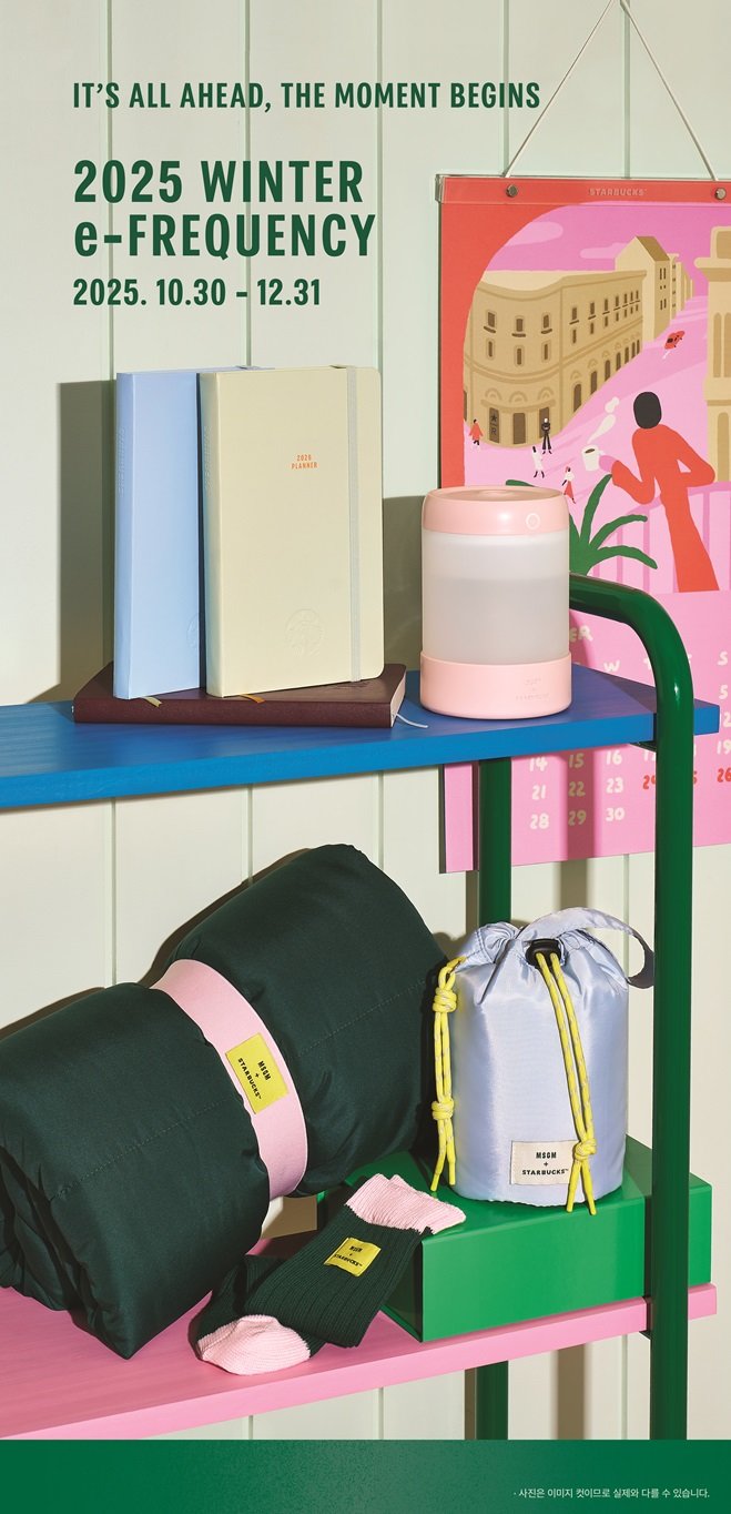이번 겨울 e-프리퀀시 증정품은 겨울 프리퀀시의 상징인 ‘플래너’(라이트그린, 스카이블루, 버건디)를 비롯해 열두 달의 특별한 순간들을 담은 ‘스타벅스 2026 캘린더’, 올해 처음 선보이는 ‘MSGM+스타벅스 블랭킷(그린, 스카이블루)’, ‘MSGM+스타벅스 가습기(그린, 핑크)’, ‘MSGM+스타벅스 양말(그린, 스카이블루)’, ‘MSGM+스타벅스 파우치(그린, 스카이블루)’까지 총 12종으로 다양하게 구성됐다.
