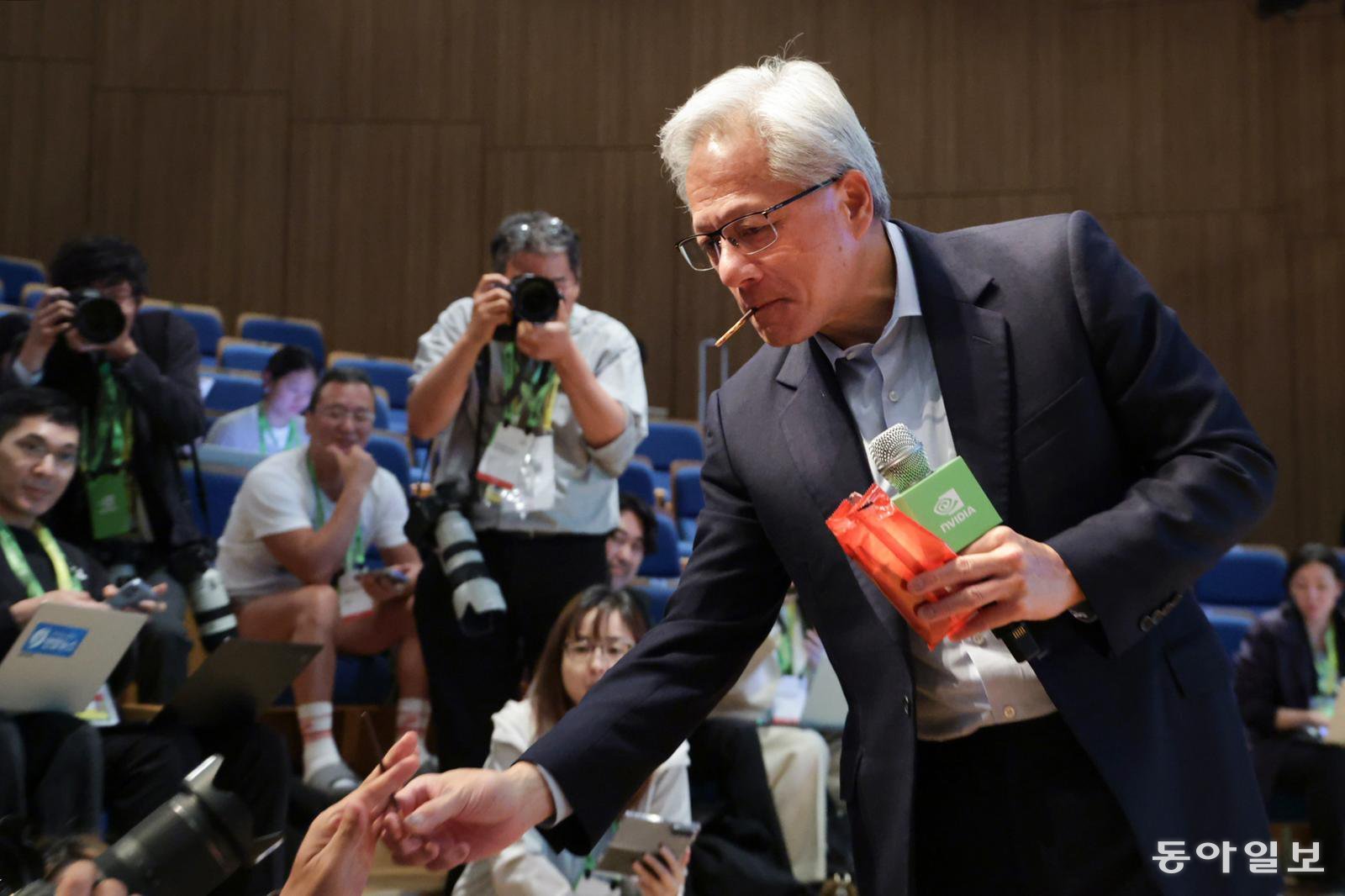 젠슨 황 엔비디아 최고경영자(CEO)가 31일 경북 경주시 경주예술의전당 원화홀에서 열린 엔비디아 기자회견에서 취재진에게 과자를 건네고 있다. 박형기 기자 oneshot@donga.com