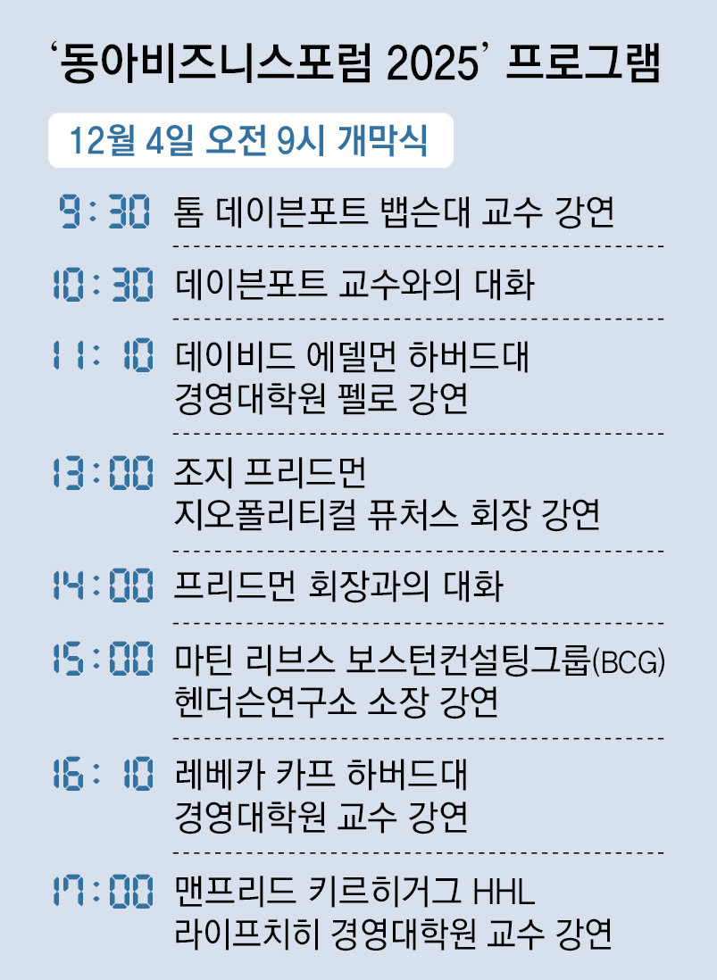 기조 강연에는 ‘세계 3대 경영사상가’로 꼽히는 톰 데이븐포트 미국 뱁슨대 교수와 ‘21세기의 노스트라다무스’로 불리는 지정학자인 조지 프리드먼 지오폴리티컬 퓨처스 회장이 나선다. 두 연사는 각각 조직 경쟁력 강화를 위한 AI 혁신 전략과 기술 패권 및 공급망 재편에 관한 통찰을 제시할 예정이다.